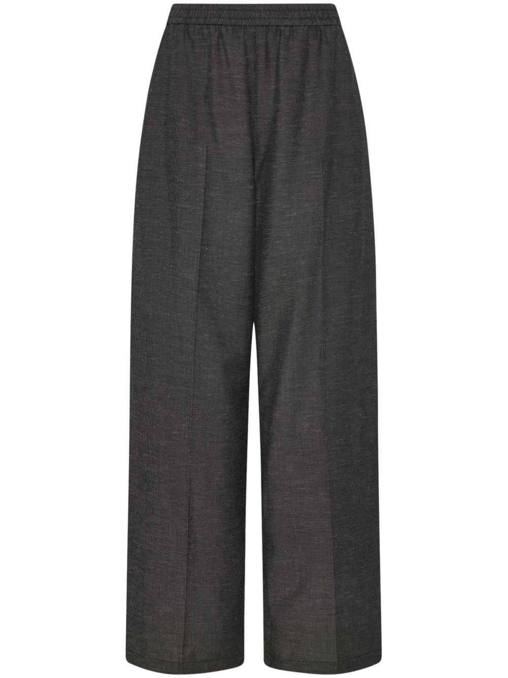 elasticated-waist wide-leg trousers Highlights - Black - Pleat detailing - Elasticated waistband - High-waisted - Wide leg - Pull-on style Made in United States Composition Polyester 77%, Rayon 16%, Linen/Flax 7%