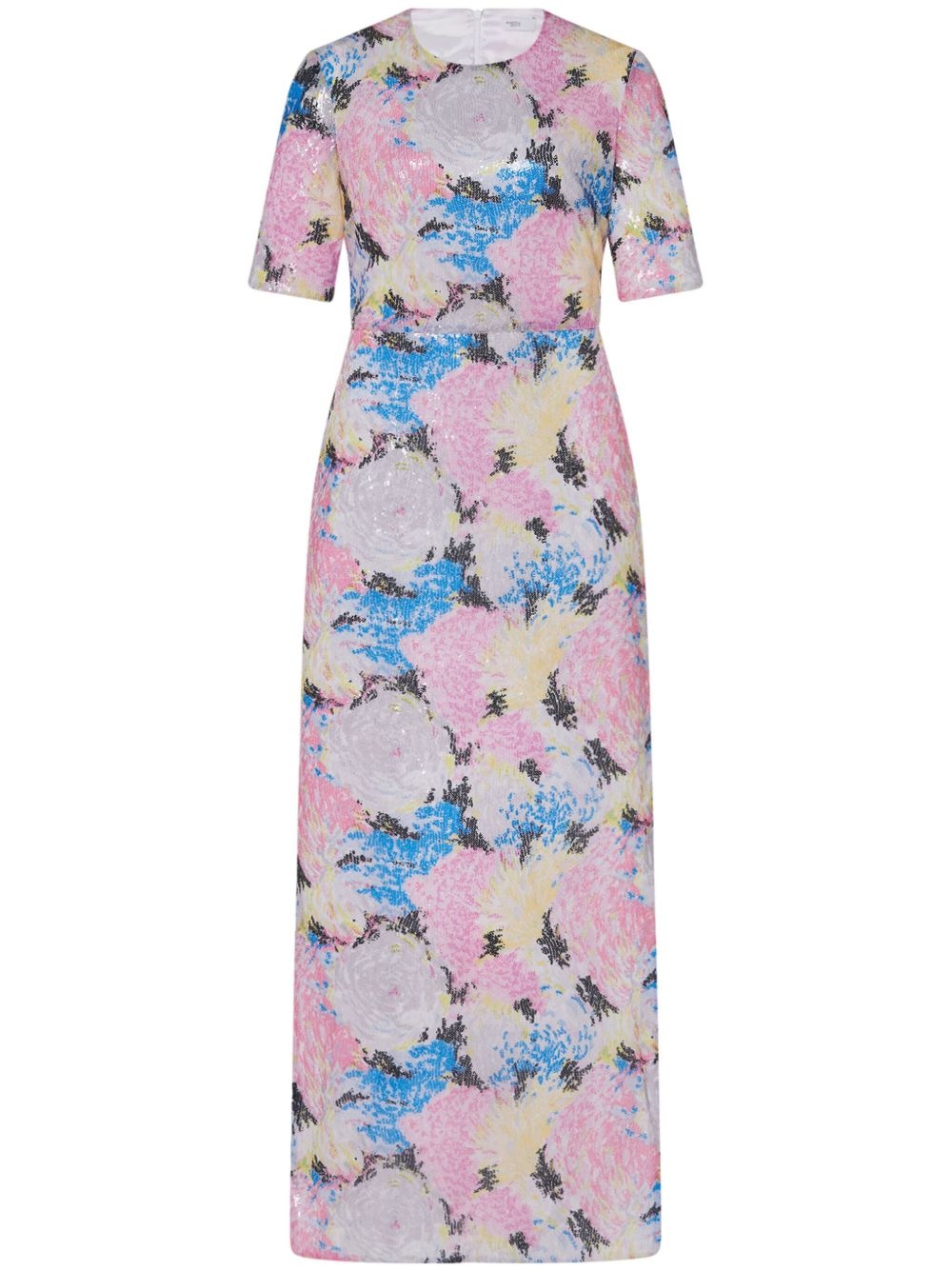 floral-motif sequinned maxi dress Highlights - Rose pink/black/multicolour - Sequin design - Floral motif - Round neck - Concealed rear zip fastening - Short sleeves - Fitted waistline - Long length - Straight hem Made in United States Composition Polyester 100%
