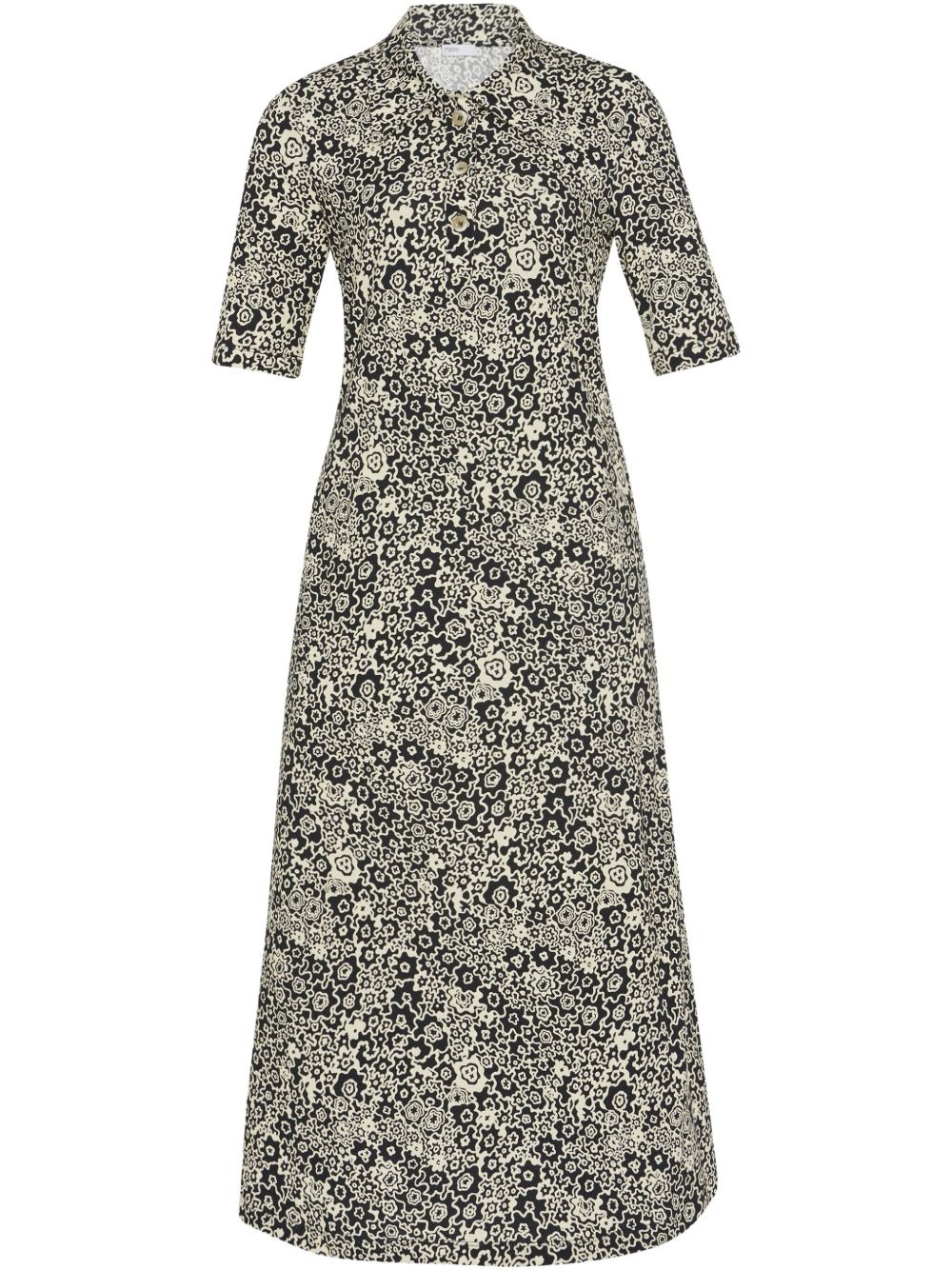 floral-print midi dress Highlights - Black - Front button fastening - Pointed flat collar - Short sleeves - Straight hem Made in United States Composition Organic Cotton 96%, Elastane 4%