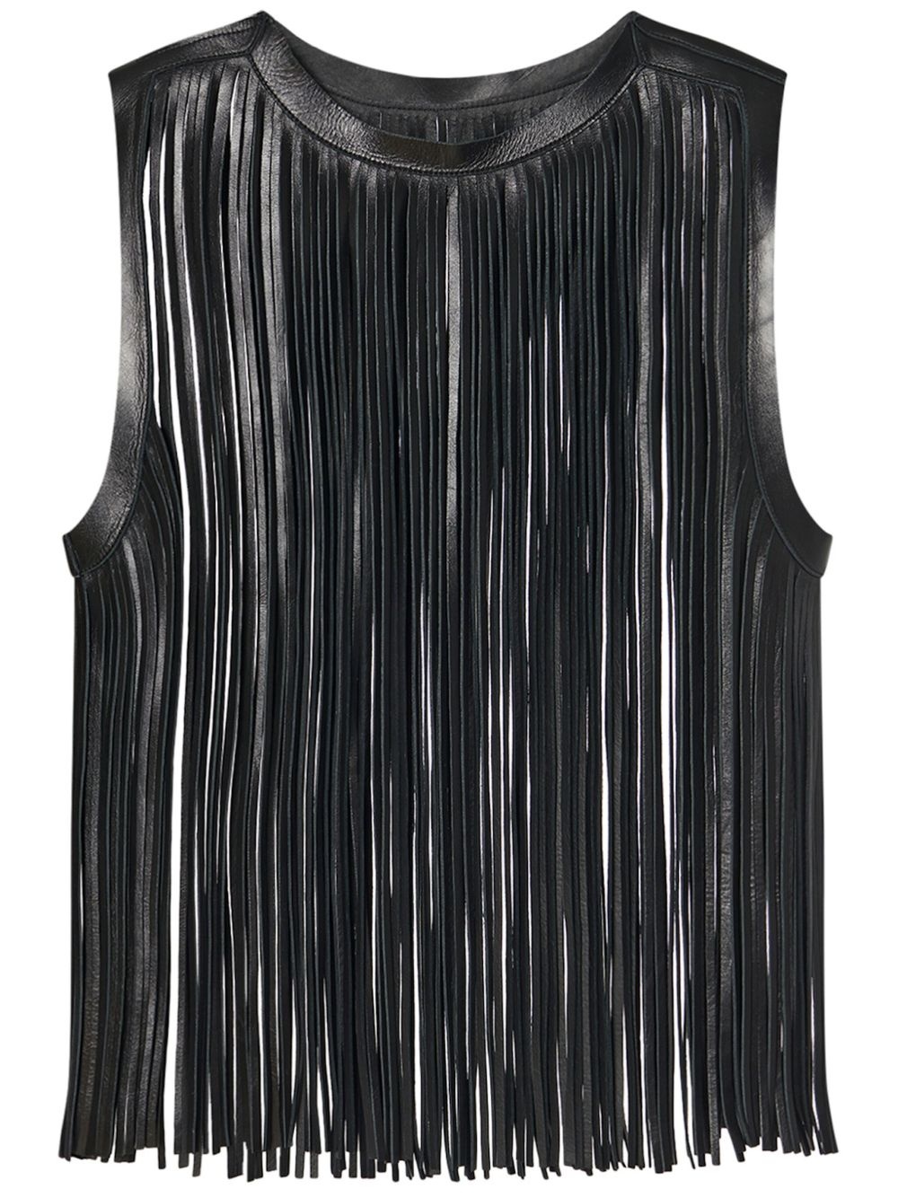 fringe leather top Highlights - Black - Calf leather - Glossy finish - Fringe detailing - Pull-on style - Round neck - Sleeveless Imported Composition CALFSKIN 100%