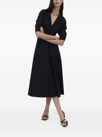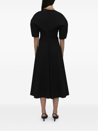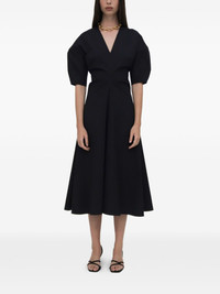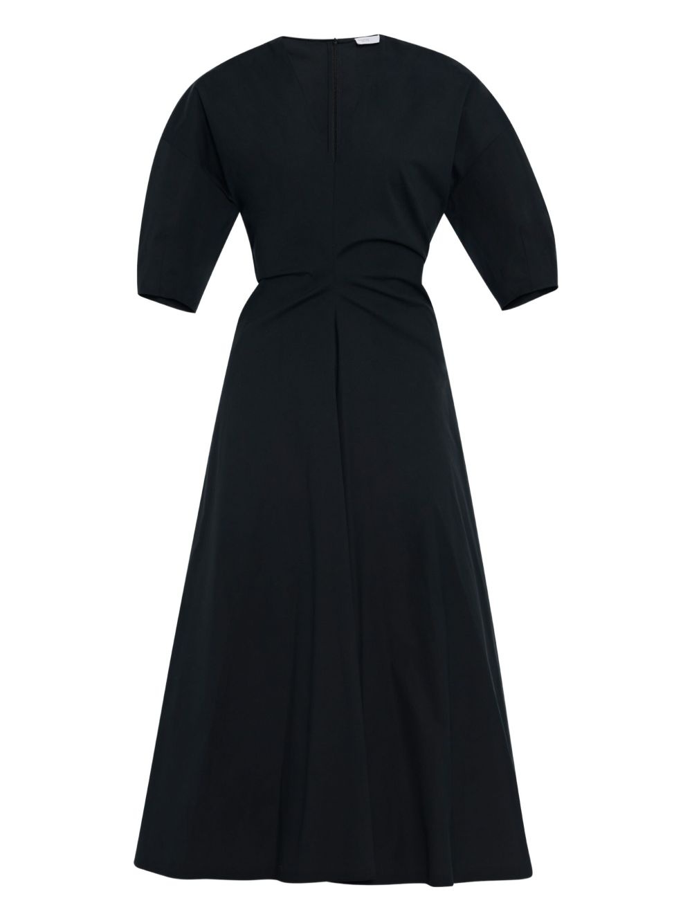 gathered midi dress Highlights - Black - V-neckline - Puff sleeves - Gathered detailing - Flared hemline Imported Composition Cotton 97%, Elastane 3% Washing instructions Read Manufacturer Guidelines