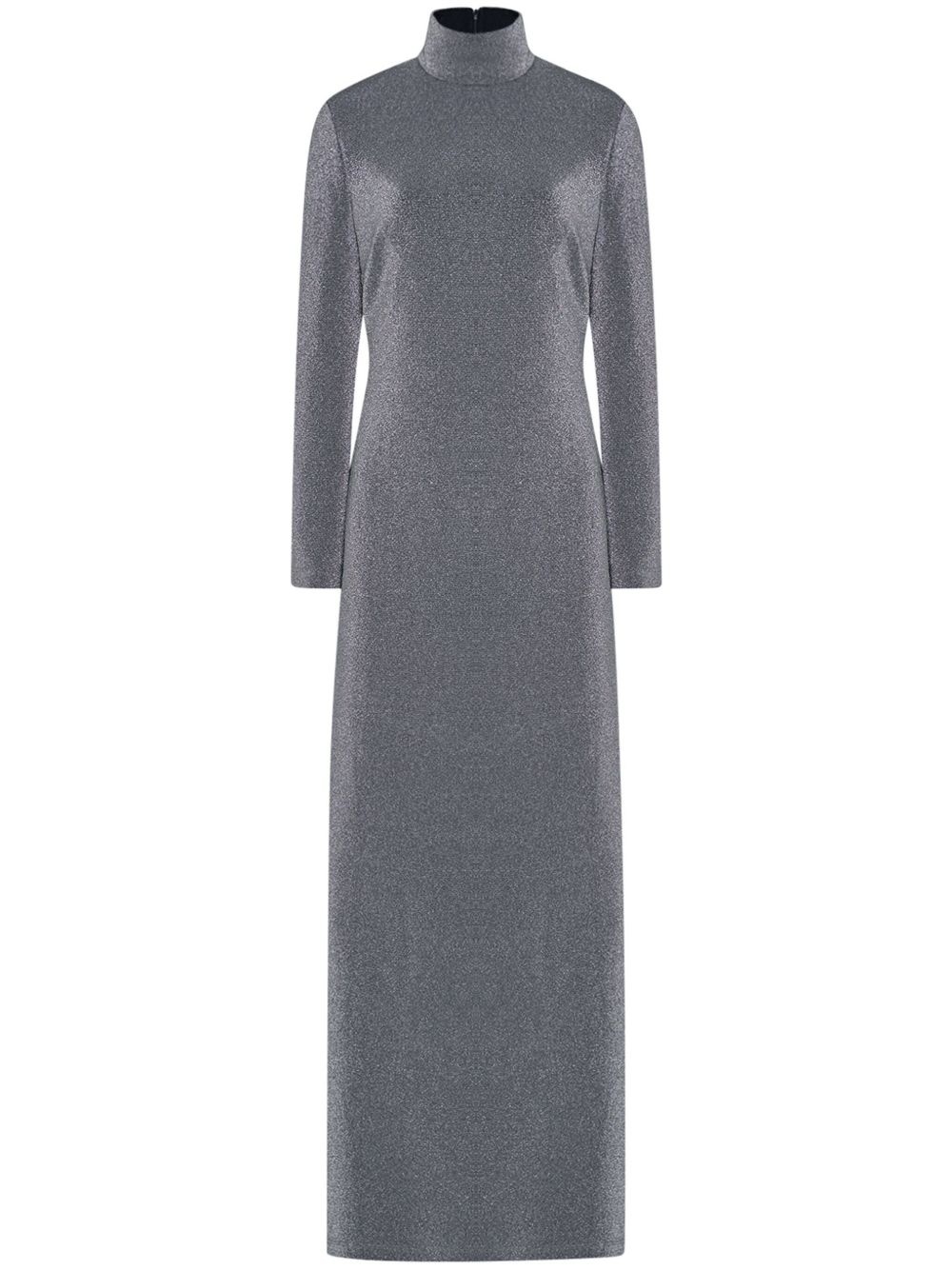 mock-neck metallic maxi dress Highlights - Silver-tone - Metallic effect - Shimmer finish - Mock neck - Long sleeves - Straight hem - Central rear vent - Floor-length Made in United States Composition Polyamide 42%, Viscose 39%, Polyester 18%, Elastane 1% Washing instructions Dry Clean Only