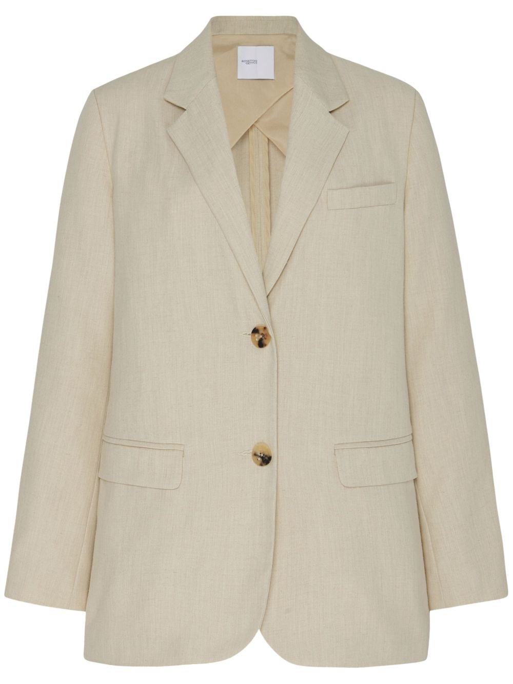 notched-lapels single-breasted blazer Highlights - Light beige - Lightweight construction - Notched lapels - Front button fastening - Long sleeves - Jetted chest pocket - Two front flap pockets - Straight hem - Partial lining Made in United States Composition Polyester 77%, Rayon 16%, Linen/Flax 7%