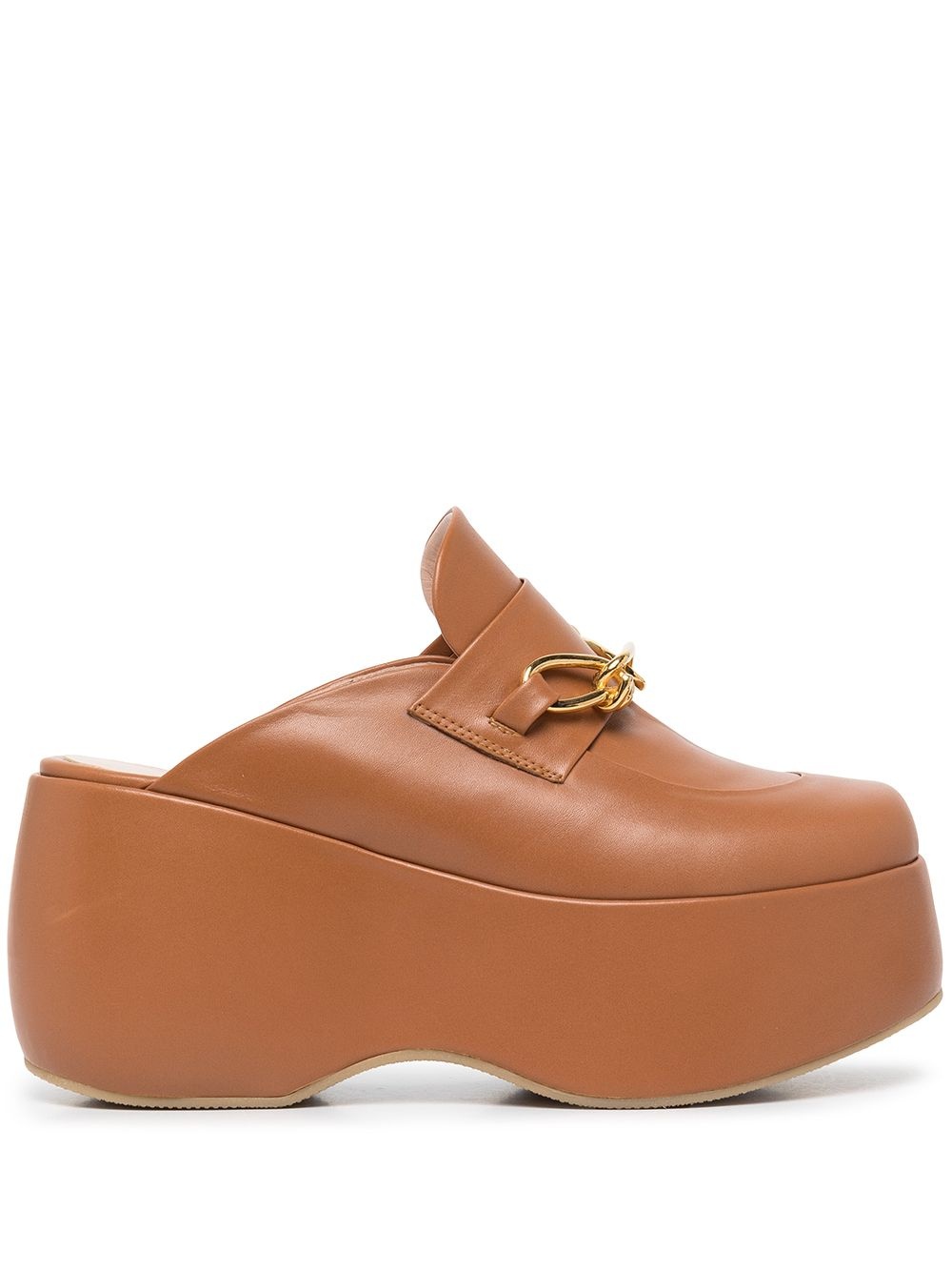 platform clog loafers cognac brown calf leather gold-tone hardware chain-link detailing branded leather insole round toe platform sole rubber sole slip-on style Made in Italy Composition Leather 100%