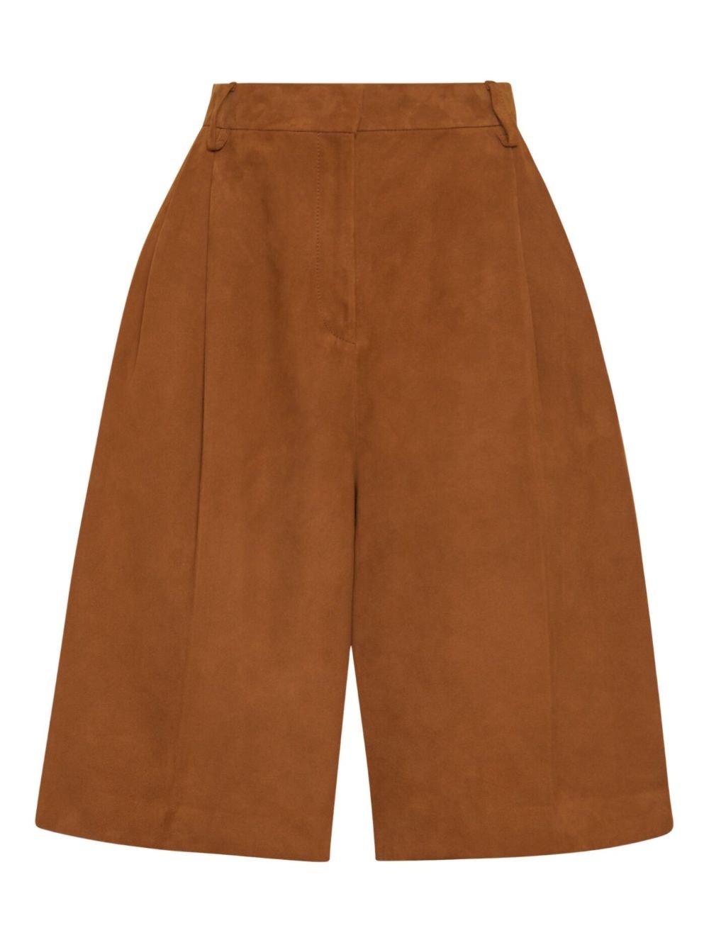 pleat-front suede shorts Highlights - Brown - Pleat detailing - High-waisted - Concealed front fastening - Straight hem - Wide leg Imported Composition Lamb Suede 100% Washing instructions Specialist Cleaning
