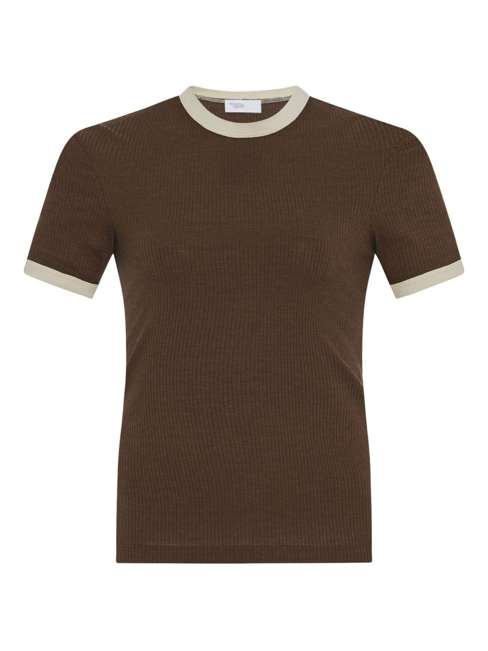 rib-knit T-shirt Highlights - Brown - Rib knit - Short sleeves - Crew neck - Contrast binding Made in United States Composition Polyester 60%, Rayon 31%, Elastane 9% Washing instructions Dry Clean Only