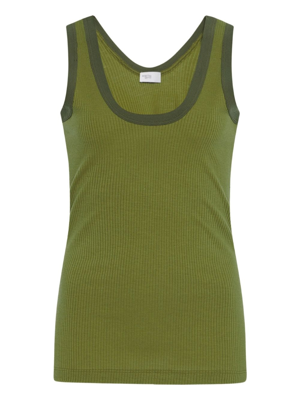 ribbed tank top Highlights - Olive green - Scoop neckline - Contrasting trim - Sleeveless design - Fitted silhouette Imported Composition Polyester 60%, Rayon 31%, Elastane 9% Washing instructions Read Manufacturer Guidelines