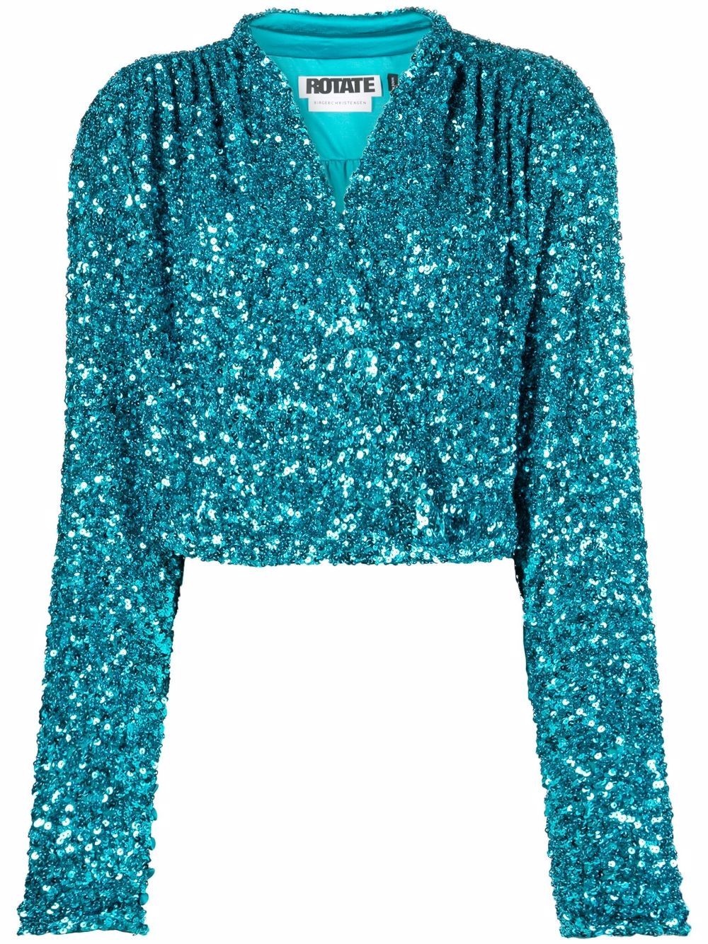 Aurelia sequin-embellished blouse Biscay Bay blue Aurelia sequin-embellished blouse from ROTATE BIRGER CHRISTENSEN. Highlights - Biscay bay blue aurelia sequin-embellished blouse from rotate featuring sequin detailing, v-neck, draped design and long sleeves. Imported Composition Outer: Polyester 100% Lining: Polyester 95%, Spandex/Elastane 5% SIZE & FIT Model measurements Height 5 ft 10 in(1.77 m) Bust/Chest 29.92 in(76 cm) Hips 34.25 in(87 cm) Waist 23.62 in(60 cm) FittingInformation This piece fits true to size. We recommend you get your regular size Cut for a loose fit Made with a mid-weight fabric