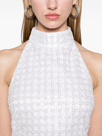 beaded halterneck mini dress Highlights - White - Recycled polyester - Tulle netting - Bead embellishment - Halterneck - Rear hook fastening - Piped-trim detailing - Sleeveless - Fitted waistline - Open back - Full lining - Straight hem - Above-knee length Imported Composition Lining: Polyester 96%, Elastane 4% Outer: Recycled Polyester 100% SIZE & FIT Measurement HIPS 34.64 in(88 cm) LENGTH 32.28 in(82 cm) WAIST 25.98 in(66 cm) Washing instructions Hand Wash