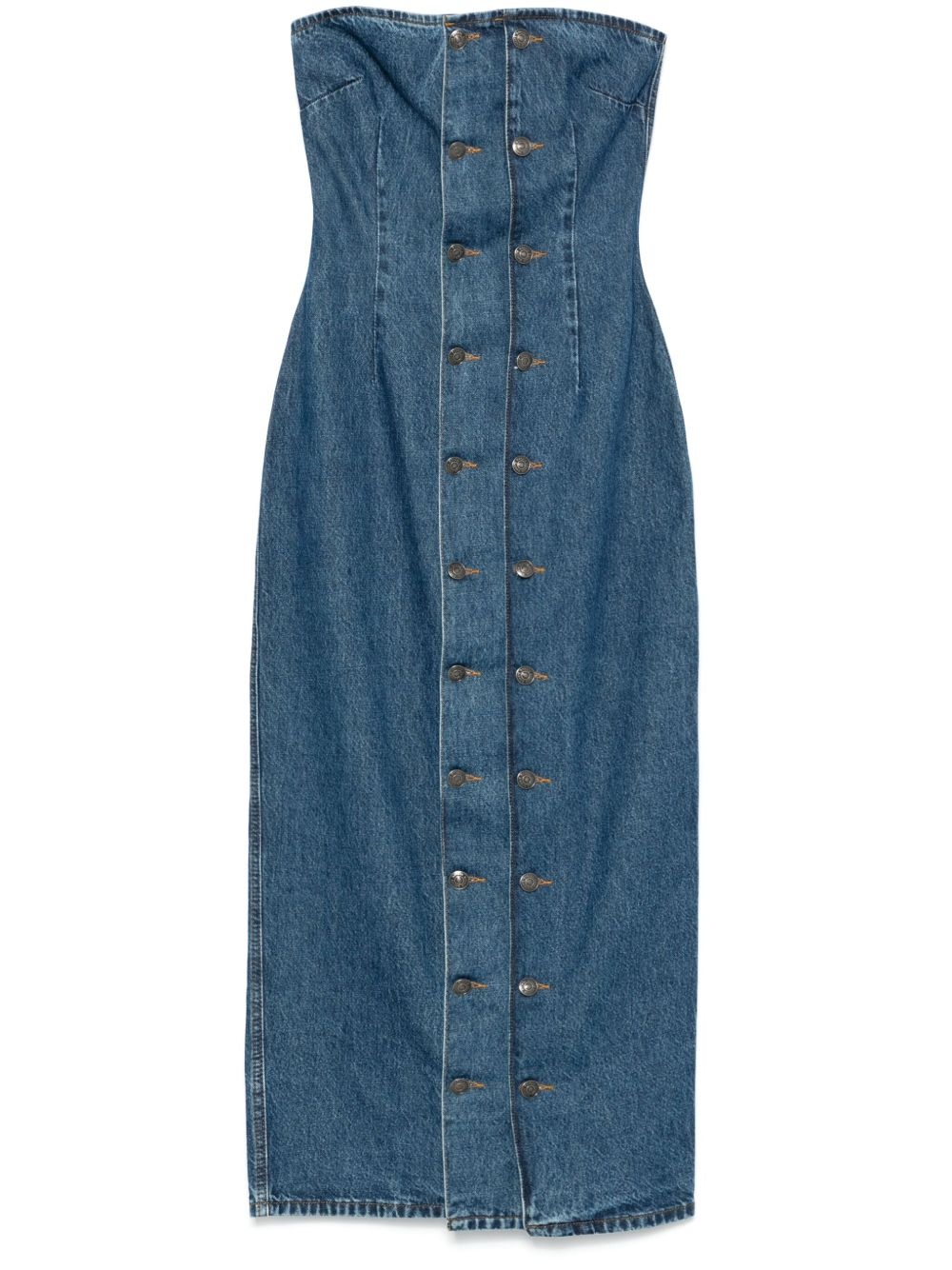 button-detail denim dress Highlights - Indigo blue - Concealed rear hook and zip fastening - Faux double-breasted front - Dart detailing - Strapless Imported Composition Organic Cotton 100% SIZE & FIT Model measurements Height 5 ft 10 in(1.78 m) Bust/Chest 32.67 in(83 cm) Hips 35.43 in(90 cm) Waist 23.22 in(59 cm) FittingInformation Designed for a close fit throughout Sturdy and hard-wearing, this denim piece offers no stretch Washing instructions Machine Wash