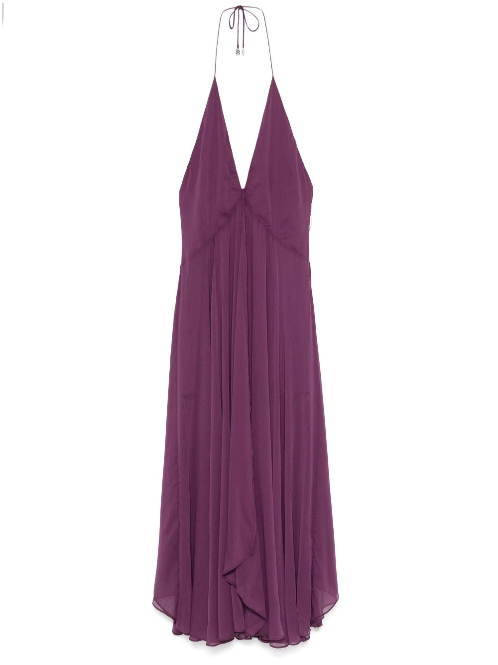 chiffon halterneck dress Highlights - Plum purple - Recycled polyester - Chiffon - Concealed rear hook and zip fastening - Halterneck tie fastening - V-neck - Sleeveless - Flared skirt - Partial lining - Low back Made in Italy Composition Lining: Polyester 92%, Elastane 8% Outer: Recycled Polyester 100% SIZE & FIT Model measurements Height 5 ft 10 in(1.78 m) Bust/Chest 33.07 in(84 cm) Hips 36.61 in(93 cm) Waist 24.8 in(63 cm) FittingInformation Designed for a close fit at the chest and waist with a loose fit at the hip Made from a midweight non-stretch fabric This piece fits true to size – take your usual size