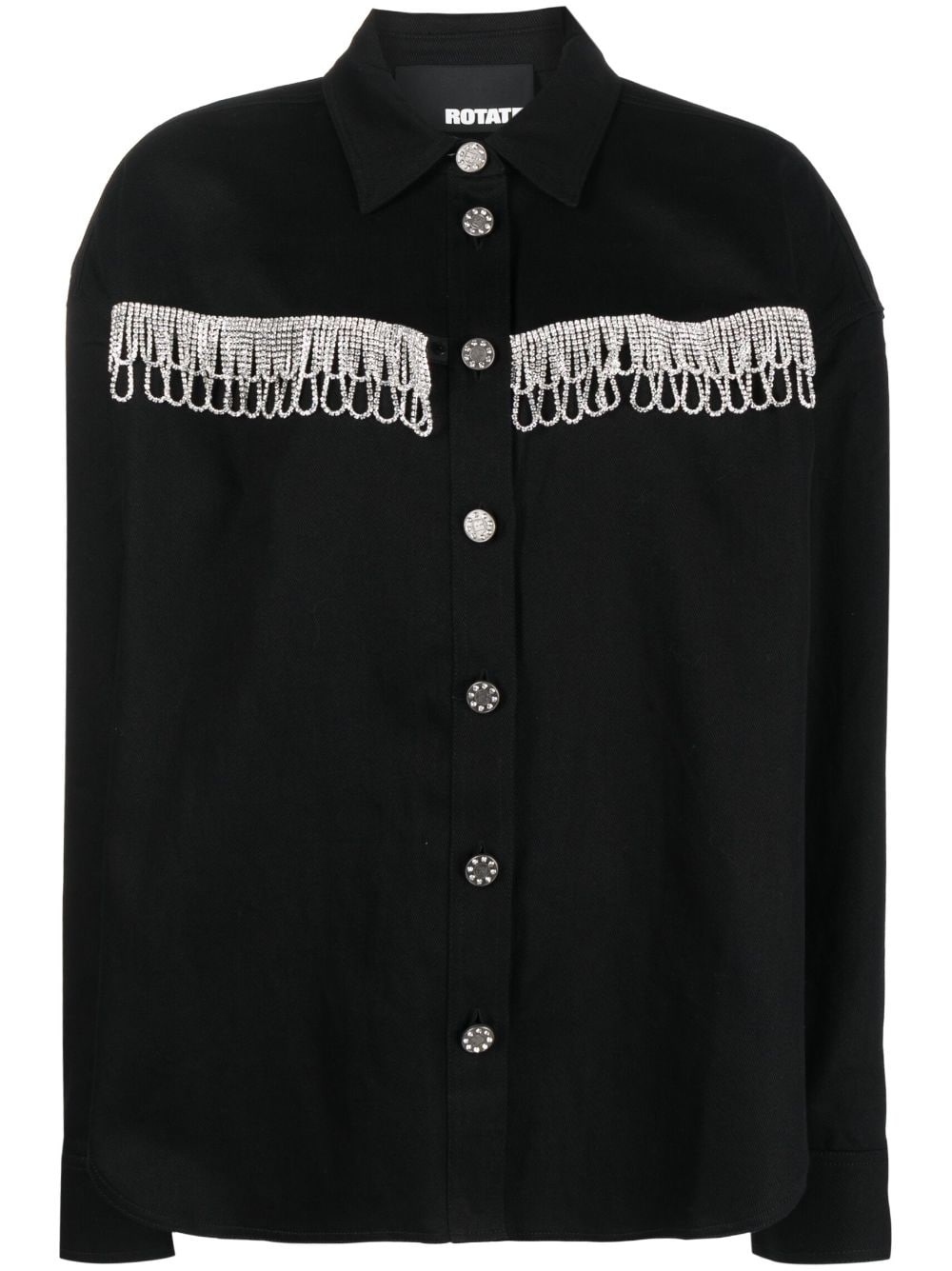 crystal-embellished long-sleeve shirt ROTATE BIRGER CHRISTENSEN's sleek, Scandinavian style reflects the brand's Danish roots. This is showcasd in an opulent way through additional crystal-embellishment detailing on this long-sleeve shirt. Highlights - Black - Crystal embellishment - Classic collar - Long sleeves - Front button fastening Imported Composition Organic Cotton 100% SIZE & FIT Model measurements Height 5 ft 10 in(1.78 m) Bust/Chest 30.7 in(78 cm) Hips 34.64 in(88 cm) Waist 23.22 in(59 cm) FittingInformation Designed for an oversized fit, offering additional room throughout The internal shoulder pads offer a structured shape Sturdy and hard-wearing, this denim piece offers no stretch This piece fits true to size – take your usual size Washing instructions Hand Wash