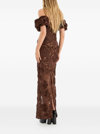 flower maxi dress Highlights - Brown - Off-the-shoulder neckline - Maxi length - Rose embellishment - Back slit Imported Composition Lining: Polyester 88%, Spandex/Elastane 12% Outer: Polyester 100%, Recycled Polyester 95%, Elastane 5% Washing instructions Read Manufacturer Guidelines