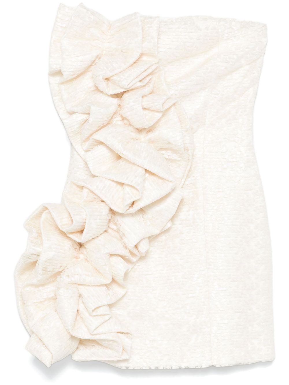 lace ruffle mini dress Highlights - Light beige - Recycled polyester - Floral-lace detailing - Plisse effect - Concealed rear zip fastening - Branded zip puller - Wide neck - Strapless - Rubber grips - Ruffled detailing - Bodycon design - Full lining - Straight hem - Thigh-length Imported Composition Lining: Viscose 97%, Elastane 3% Outer: Recycled Polyester 100% SIZE & FIT Model measurements Height 5 ft 10 in(1.78 m) Bust/Chest 33.85 in(86 cm) Hips 36.61 in(93 cm) Waist 26.77 in(68 cm) FittingInformation Designed for a slim fit that sits just away from the body offering a close yet comfortable fit Made from a lightweight fabric Washing instructions Do Not Wash/Do Not Dry Clean