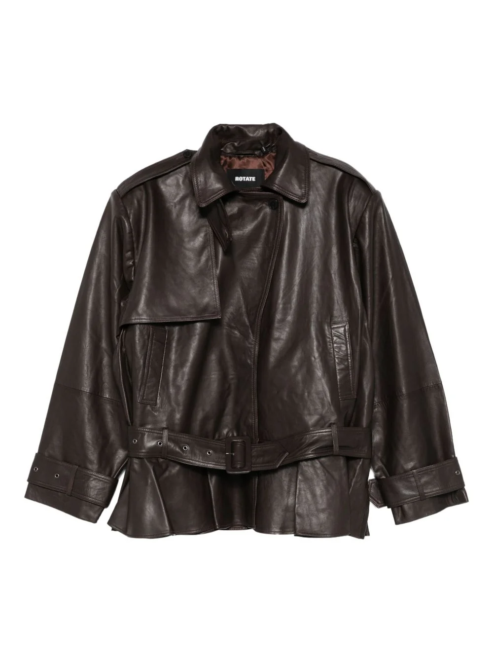leather jacket Highlights - Dark brown - Belt - Peplum hem - Front flap detail - Buttoned cuffs - Point collar Imported Composition Outer: Lamb Skin 100% Lining: Polyester 100% SIZE & FIT Model measurements Height 5 ft 10 in(1.78 m) Bust/Chest 33.46 in(85 cm) Hips 36.22 in(92 cm) Waist 23.22 in(59 cm) Washing instructions Do Not Wash/Do Not Dry Clean