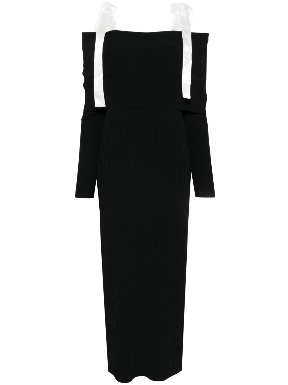 off-shoulder knitted maxi dress Highlights - Black - Ribbed knit - Off-shoulder - Satin tie-fastening straps - Folded top - Square neck - Long sleeves - Unlined - Straight hem - Full-length Imported Composition Outer: Viscose 66%, Polyamide 20%, Polyester 14% Lining: Polyester 100%