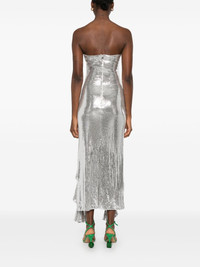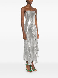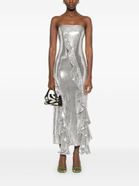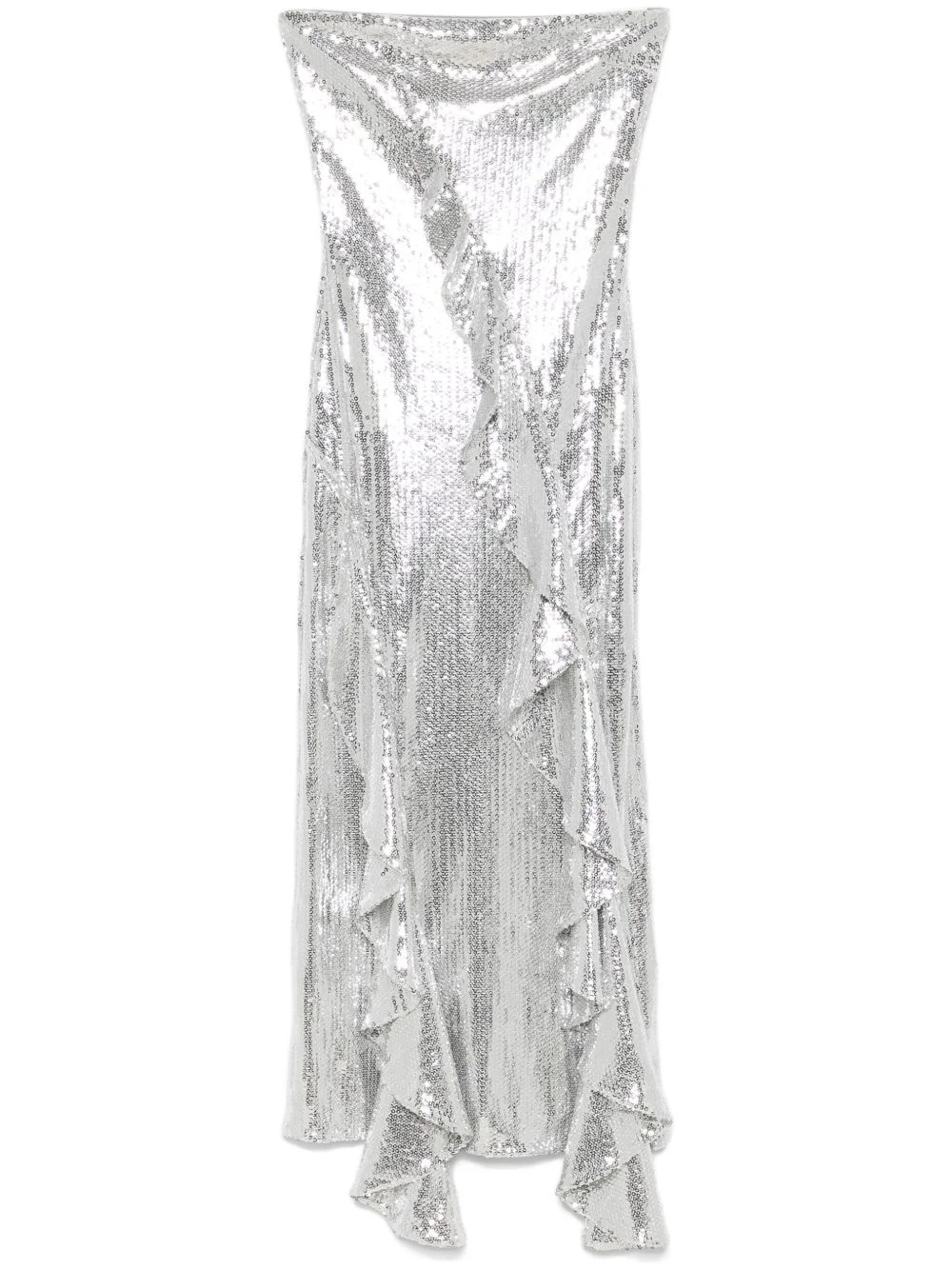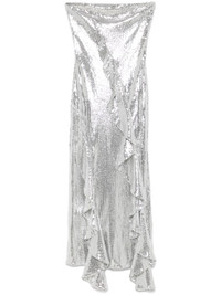 ruffled-trim sequinned maxi dress Highlights - Silver-tone - Recycled polyester blend - Sequin design - Rear zip fastening - Bandeau style - Strapless - Ruffled trim - Sash detail - Full lining - Flared hem - Mid-length Imported Composition Lining: Polyester 95%, Elastane 5% Outer: Recycled Polyester 95%, Elastane 5% SIZE & FIT Model measurements Height 5 ft 10 in(1.78 m) Bust/Chest 31.49 in(80 cm) Hips 37 in(94 cm) Waist 23.62 in(60 cm) FittingInformation Designed for a close fit throughout The vented hem offers movement at the rear Made from a midweight fabric