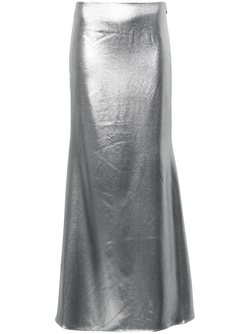 semi-train metallic-effect maxi skirt Highlights - Silver-tone - Recycled polyester - Stretch-design - Metallic effect - Mermaid silhouette - Full-length - Ruched detailing to the rear - Demi-train - Branded zip puller - Concealed side hook and zip fastening Made in Italy Composition Lining: Viscose 97%, Elastane 3% Outer: Recycled Polyester 100%, Polyester 100% SIZE & FIT Model measurements Height 5 ft 9 in(1.76 m) Bust/Chest 31.88 in(81 cm) Hips 35.43 in(90 cm) Waist 22.44 in(57 cm) Measurement HIPS 36.22 in(92 cm) LENGTH 21.65 in(55 cm) WAIST 29.92 in(76 cm) FittingInformation This maxi-length skirt is intended to be worn high on the waist Made from a midweight fabric This piece fits true to size – take your usual size Washing instructions Hand Wash
