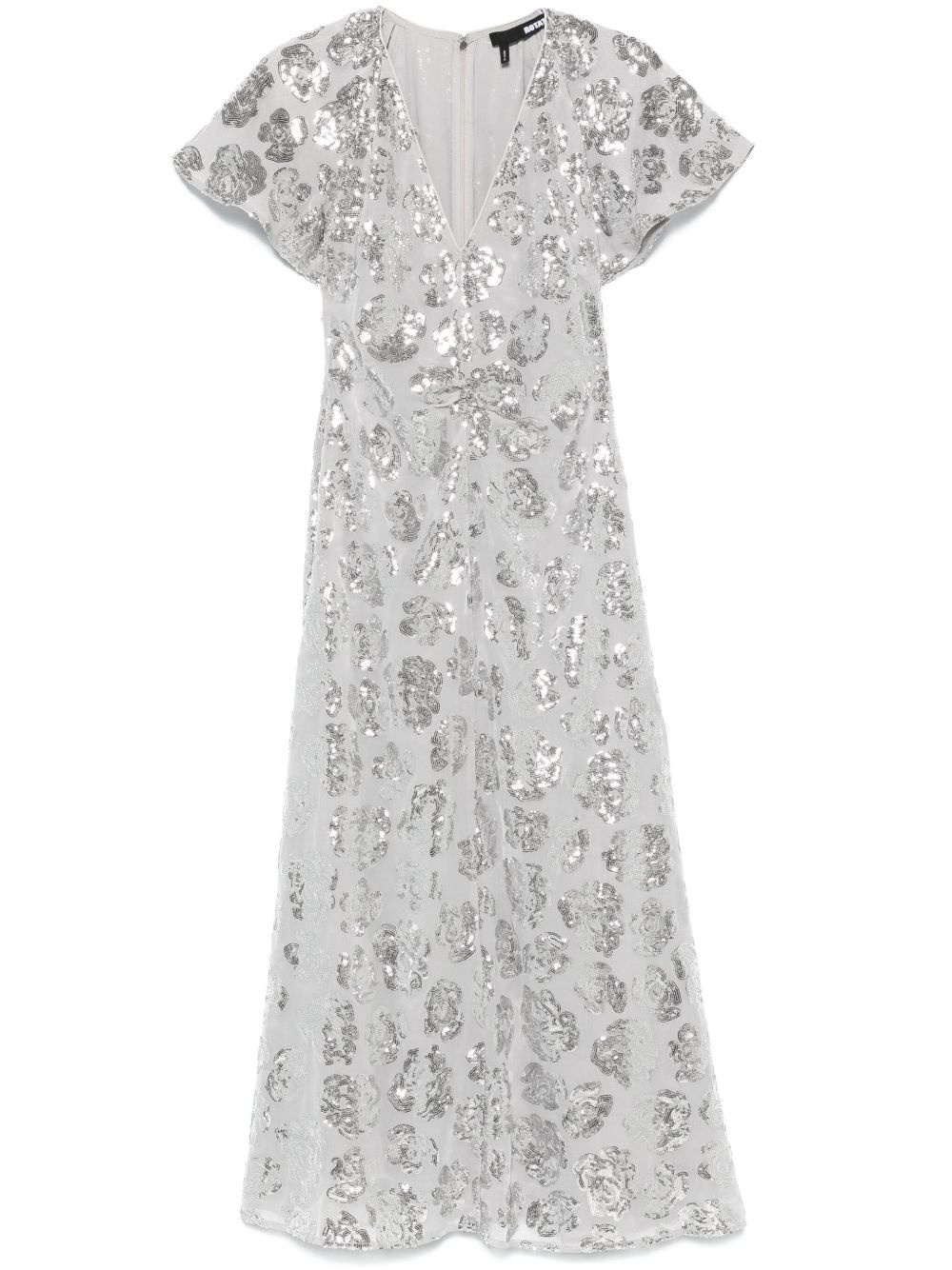 sequin-embellished chiffon midi dress Highlights - Light grey - Recycled polyester - Chiffon - Sequin embellishment - Floral embroidery - Concealed rear hook and zip fastening - V-neck - Flutter sleeves - Ruched detailing - Full lining - Flared hem - Mid-length Imported Composition Lining: Recycled Polyester 100% Outer: Recycled Polyester 100% SIZE & FIT Model measurements Height 5 ft 11 in(1.8 m) Bust/Chest 33.07 in(84 cm) Hips 37.4 in(95 cm) Waist 25.19 in(64 cm) FittingInformation Designed for a close fit at the chest and waist with a loose fit at the hip Made from a midweight non-stretch fabric