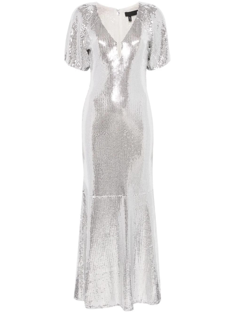 sequinned midi dress Highlights - Silver-tone - Recycled polyester blend - Sequin embellishment - Concealed rear hook and zip fastening - Plunging v-neck - Short puff sleeves - Single front button fastening - Fitted waistline - A-line skirt - Mesh lining - Straight hem - Mid-length Imported Composition Outer: Polyester 100%, Recycled Polyester 95%, Elastane 5% Lining: Elastane 5% SIZE & FIT Model measurements Height 5 ft 9 in(1.75 m) Bust/Chest 31.88 in(81 cm) Hips 34.64 in(88 cm) Waist 24.01 in(61 cm) Measurement SLEEVE LENGTH 12.99 in(33 cm) HIPS 36.22 in(92 cm) LENGTH 55.9 in(142 cm) WAIST 29.92 in(76 cm) FittingInformation Designed for a close fit throughout Made from a midweight stretch fabric, this piece offers elasticity and flexibility when worn Washing instructions Hand Wash