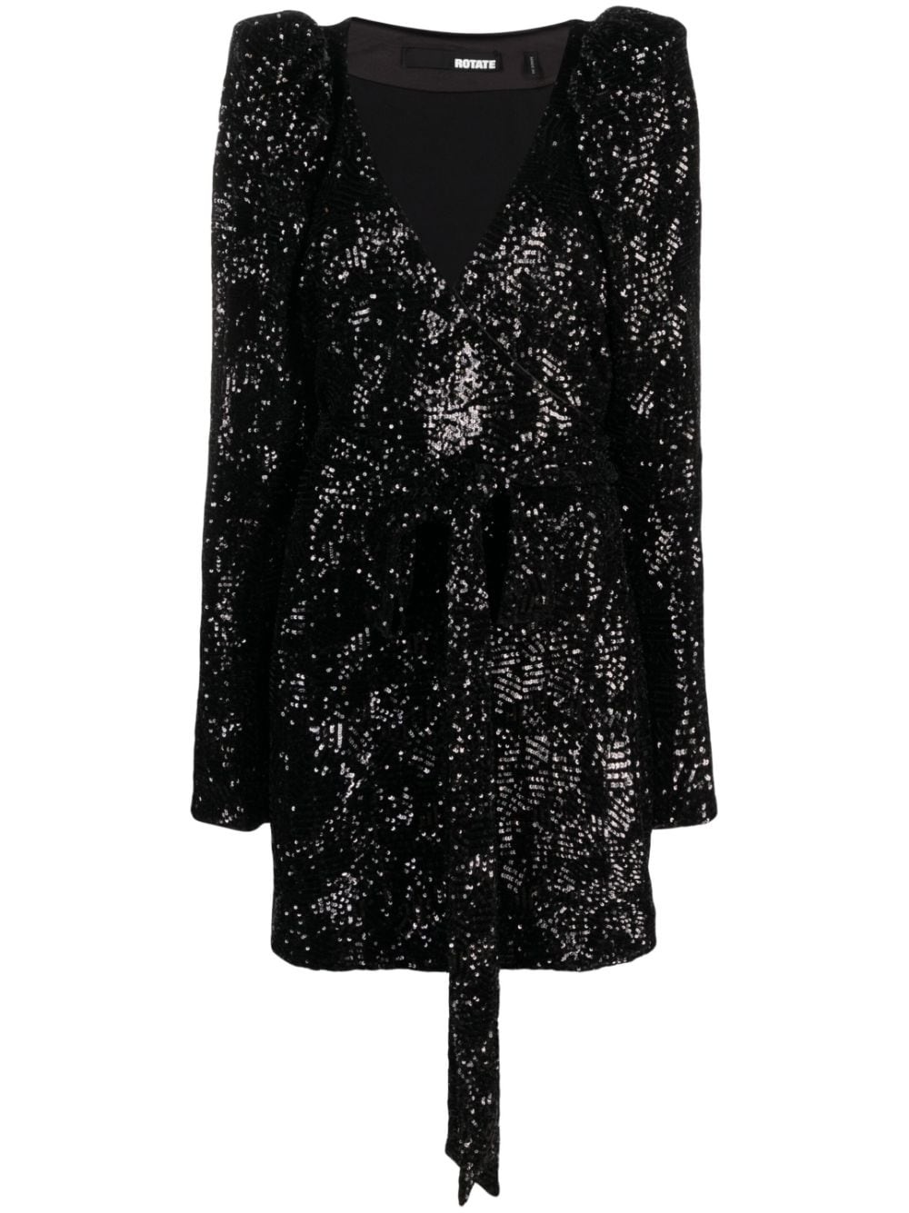 sequinned-tulle wrap minidress The sequinned finish and puff shoulders of this black tulle ROTATE BIRGER CHRISTENSEN dress are inspired by the baroque and gothic glamour of Paris’ Hotel Costes and the late Vivienne Westwood. It’s cut to a wrap silhouette with a self-tie that cascades past the mini hem. Highlights - Black - Recycled polyester blend - Tulle netting - Sequin design - Wrap design - V-neck - Side tie fastening - Concealed side button fastening - Long puff sleeves - Thigh-length - Straight hem - Full lining Made in Italy Composition Outer: Recycled Polyester 95%, Elastane 5% Lining: Polyester 88%, Elastane 12% Washing instructions Dry Clean Only