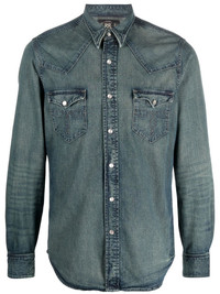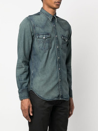 dark-wash denim shirt dark wash blue cotton washed denim Western-style panelling front press-stud fastening pointed flat collar two chest patch pockets long sleeves press-stud fastening cuffs curved hem Imported Composition Cotton 100% SIZE & FIT Model measurements Height 6 ft 2 in(1.87 m) Bust/Chest 37 in(94 cm) Hips 33.85 in(86 cm) Waist 27.95 in(71 cm) FittingInformation This piece fits true to size. We recommend you get your regular size Cut for a slim fit Made with a mid-weight non-stretch fabric Washing instructions Machine Wash