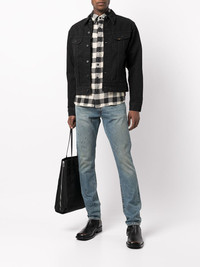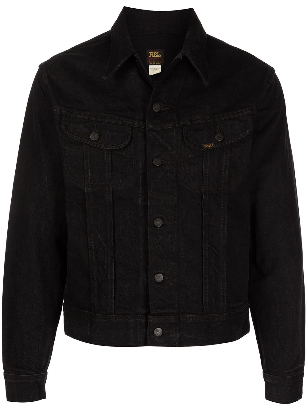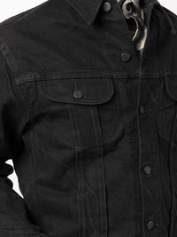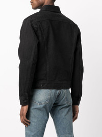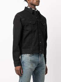 denim trucker jacket black cotton front button fastening two chest patch pockets classic collar long sleeves straight hem Imported Composition Cotton 100% SIZE & FIT Model measurements Height 6 ft 1 in(1.85 m) Bust/Chest 39.76 in(101 cm) Hips 36.61 in(93 cm) Waist 27.95 in(71 cm) FittingInformation This piece fits true to size. We recommend you get your regular size Cut for a loose fit Made with a mid-weight non-stretch fabric Washing instructions Dry Clean Only