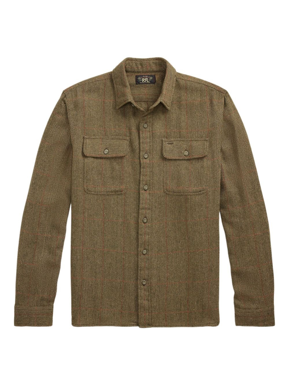 Grayson check-patterned button-up shirt Highlights - Olive green - Chest pockets - Button-down front - Contrasting elbow patches - Long sleeves Imported Composition Recycled Wool 36%, Polyester 31%, Cotton 30%, Nylon 3% Washing instructions Read Manufacturer Guidelines