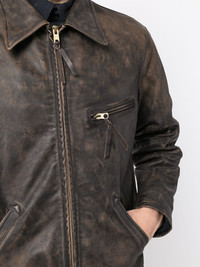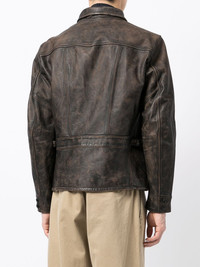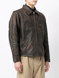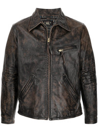 zipped leather jacket This Ralph Lauren RRL leather jacket is developed in a mottled black and brown hue for an aged aesthetic. Showcasing adjustable buckled tabs at the waist and three front pockets, the design displays a classic silhouette with a front zip fastening. Imported Composition Leather 100% SIZE & FIT Model measurements Height 6 ft 2 in(1.87 m) Bust/Chest 35.43 in(90 cm) Hips 36.41 in(92.5 cm) Waist 27.55 in(70 cm) FittingInformation This piece fits true to size. We recommend you get your regular size Cut for a relaxed fit Made from supple hide
