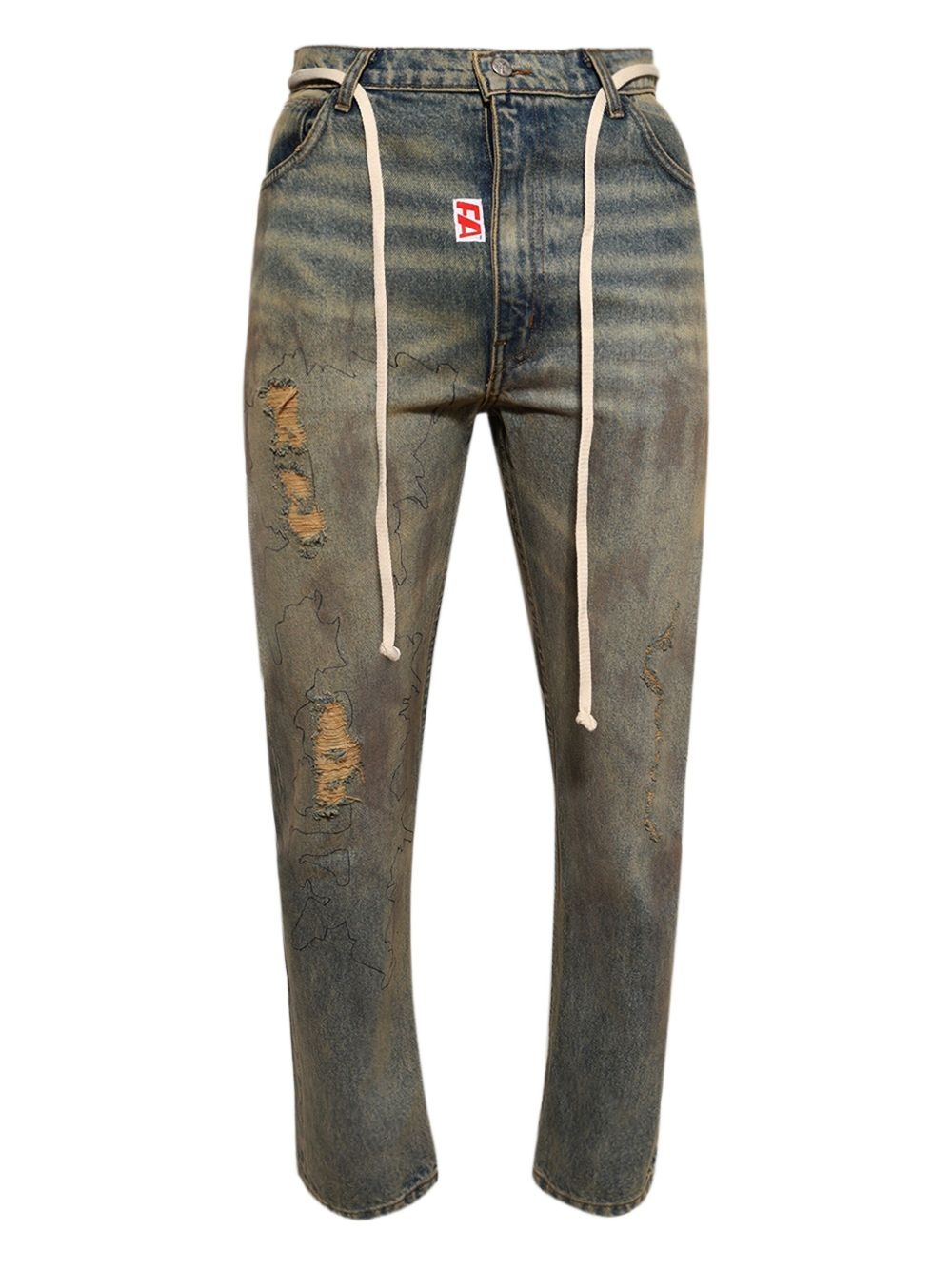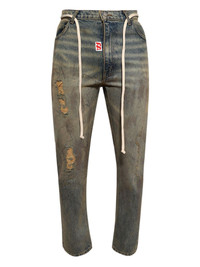 distressed denim jeans Highlights - Faded blue - Ripped detailing - Drawstring detail - Slim cut - Classic five-pocket Imported Composition Cotton 100% Washing instructions Dry Clean Only