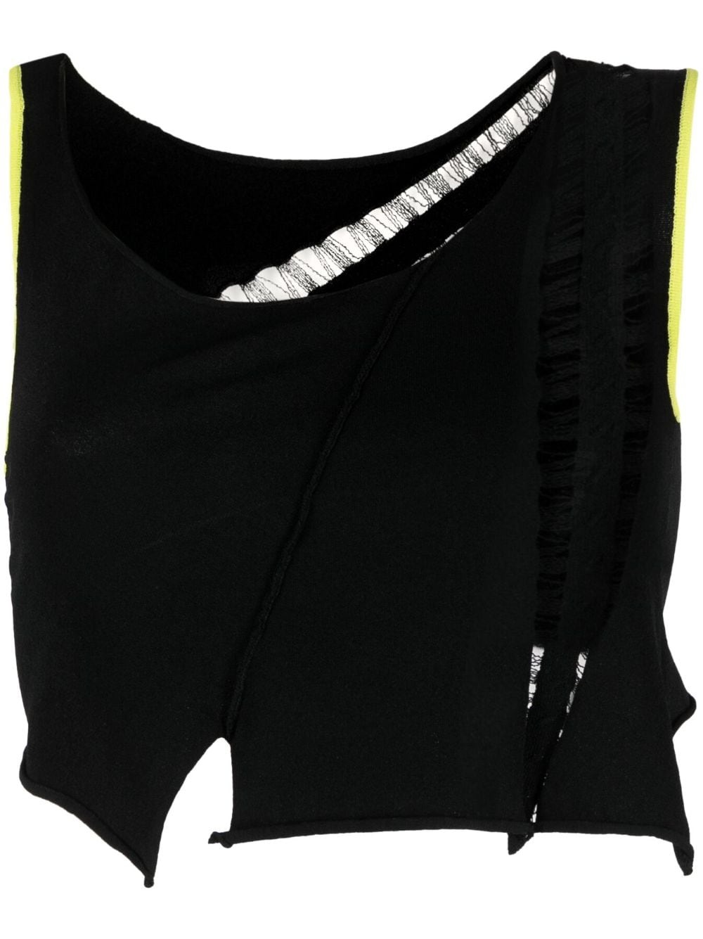 Float asymmetric cropped top Handcrafted from lightweight stretch jersey, RUI's Float top is rendered in an onyx black hue and trimmed with fluorescent green piping throughout for a unique appearance. Cut for a cropped length, the design is punctuated with slashes and cut-outs. Highlights - Onyx black/fluorescent green - Stretch-jersey - Round neck - Sleeveless - Piped-trim detailing - Cut-out detailing - Asymmetric design - Cropped Imported Composition Viscose 100% SIZE & FIT Model measurements Height 5 ft 10 in(1.79 m) Bust/Chest 31.1 in(79 cm) Hips 35.03 in(89 cm) Waist 24.01 in(61 cm) FittingInformation Designed for a slim fit that sits just away from the body offering a close yet comfortable fit Made with a lightweight knit, this piece offers some stretch This piece fits true to size – take your usual size