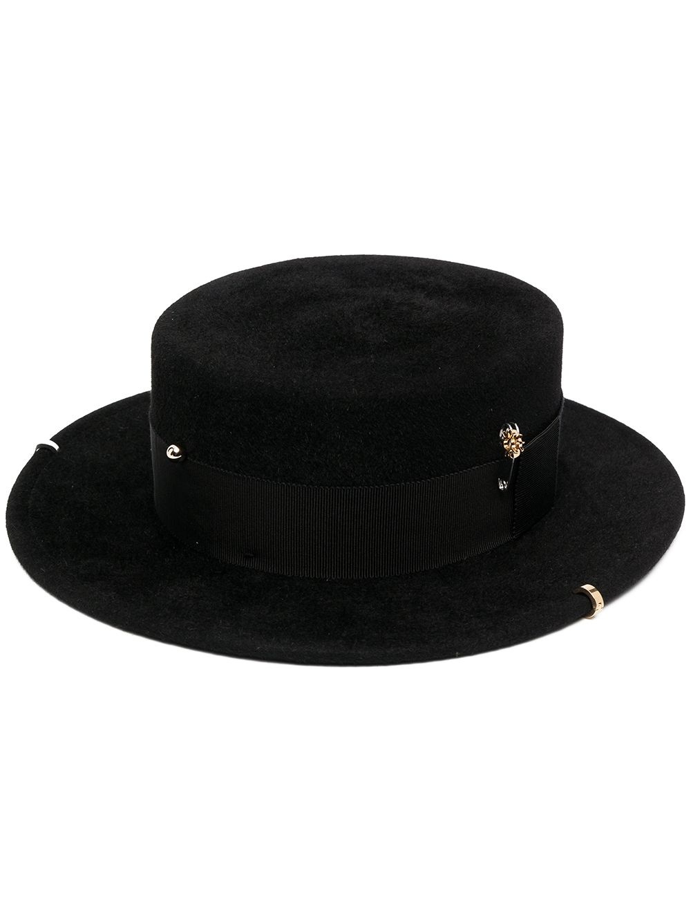 chain-embellished boater hat Focused exclusively on headwear, Ruslan Baginskiy is where tradition meets modernity, with classic shapes being reinvented for a contemporary feel. Presented in classic black, this hat from the brand’s AW21 collection is punctuated by mixed metal detailing for a distinctive feel. Imported Composition Outer: Felt 100% Lining: Cotton 100% SIZE & FIT Measurement BRIM 2.55 in(6.5 cm) CIRCUMFERENCE 21.65 in(55 cm)