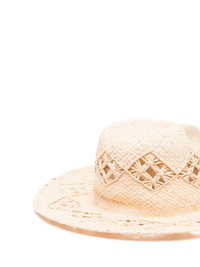 interwoven-straw fedora hat Highlights - Sand beige - Straw - Interwoven design - Cut-out detailing - Embroidered logo - Centre-dent crown - Wide brim Imported Composition Straw 100% SIZE & FIT Measurement BRIM 3.74 in(9.5 cm) CIRCUMFERENCE 21.25 in(54 cm)