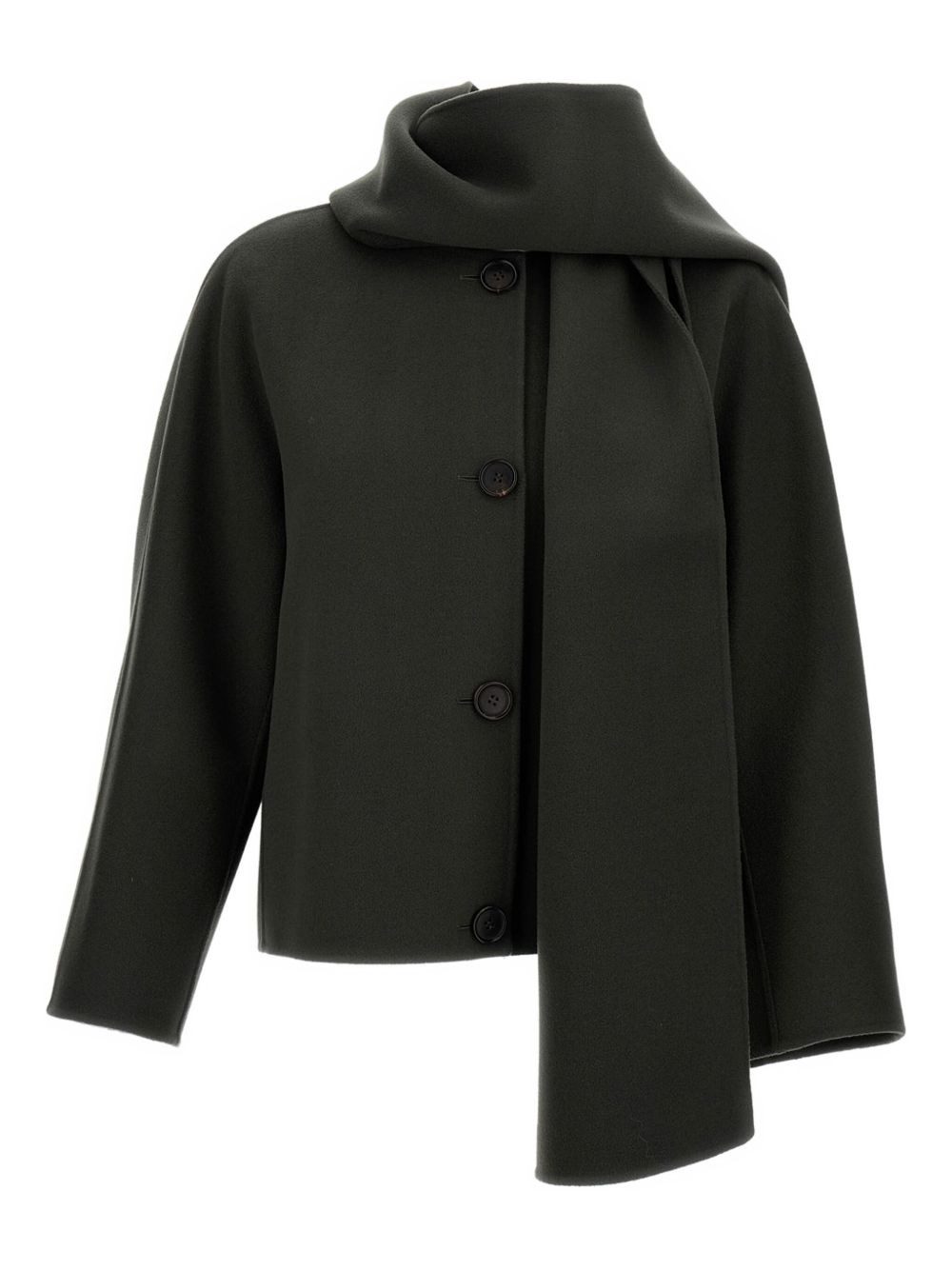 button-fastening scarf-neck jacket Highlights - Dark green - Button front fastening - Attached scarf neck - Virgin wool Imported Composition Virgin Wool 100% Washing instructions Read Manufacturer Guidelines