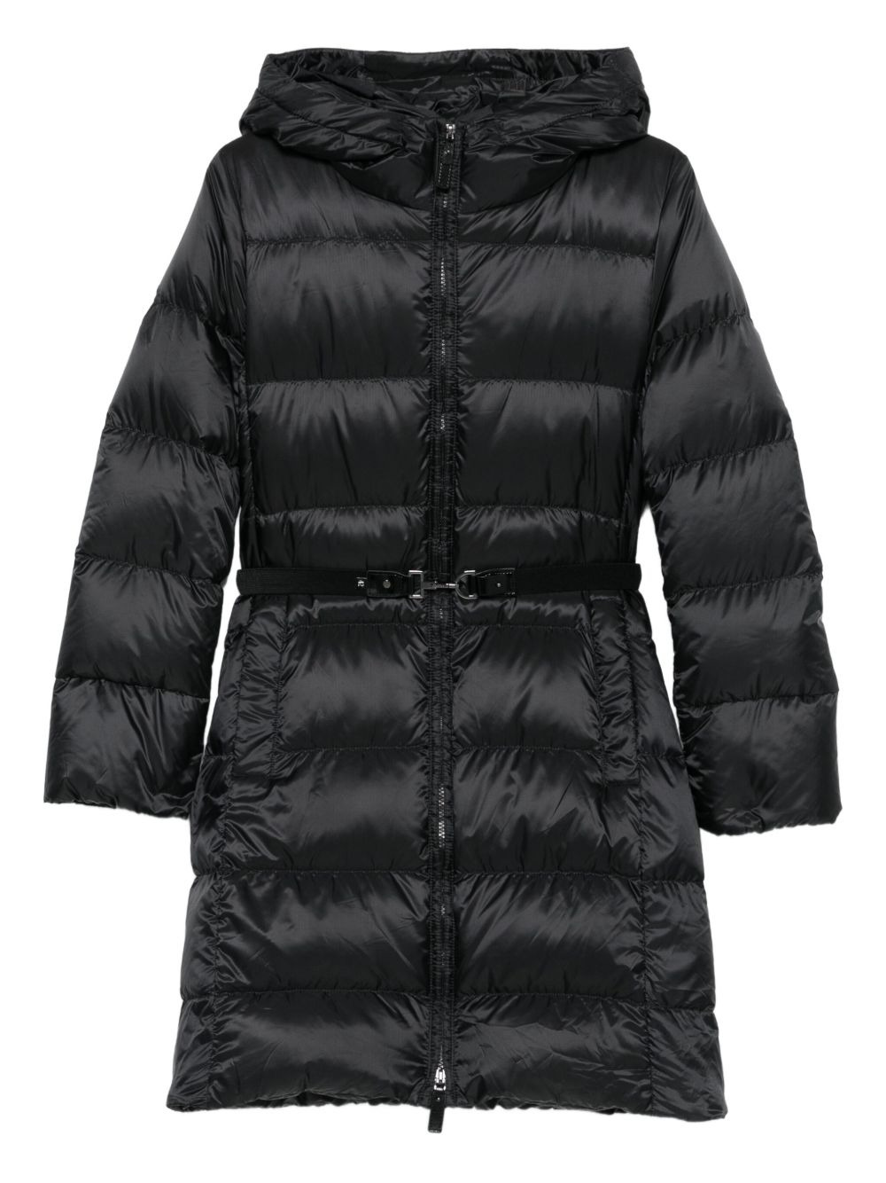 hooded belted coat Highlights - Black - Hooded design - Quilted finish - Front zip fastening - Belted waist - Long sleeves Imported Composition Outer: Polyester 100% Lining: Polyester 100%, Goose Down 100% SIZE & FIT Model measurements Height 5 ft 11 in(1.8 m) Bust/Chest 31.49 in(80 cm) Hips 36.61 in(93 cm) Waist 24.4 in(62 cm) Washing instructions Machine Wash