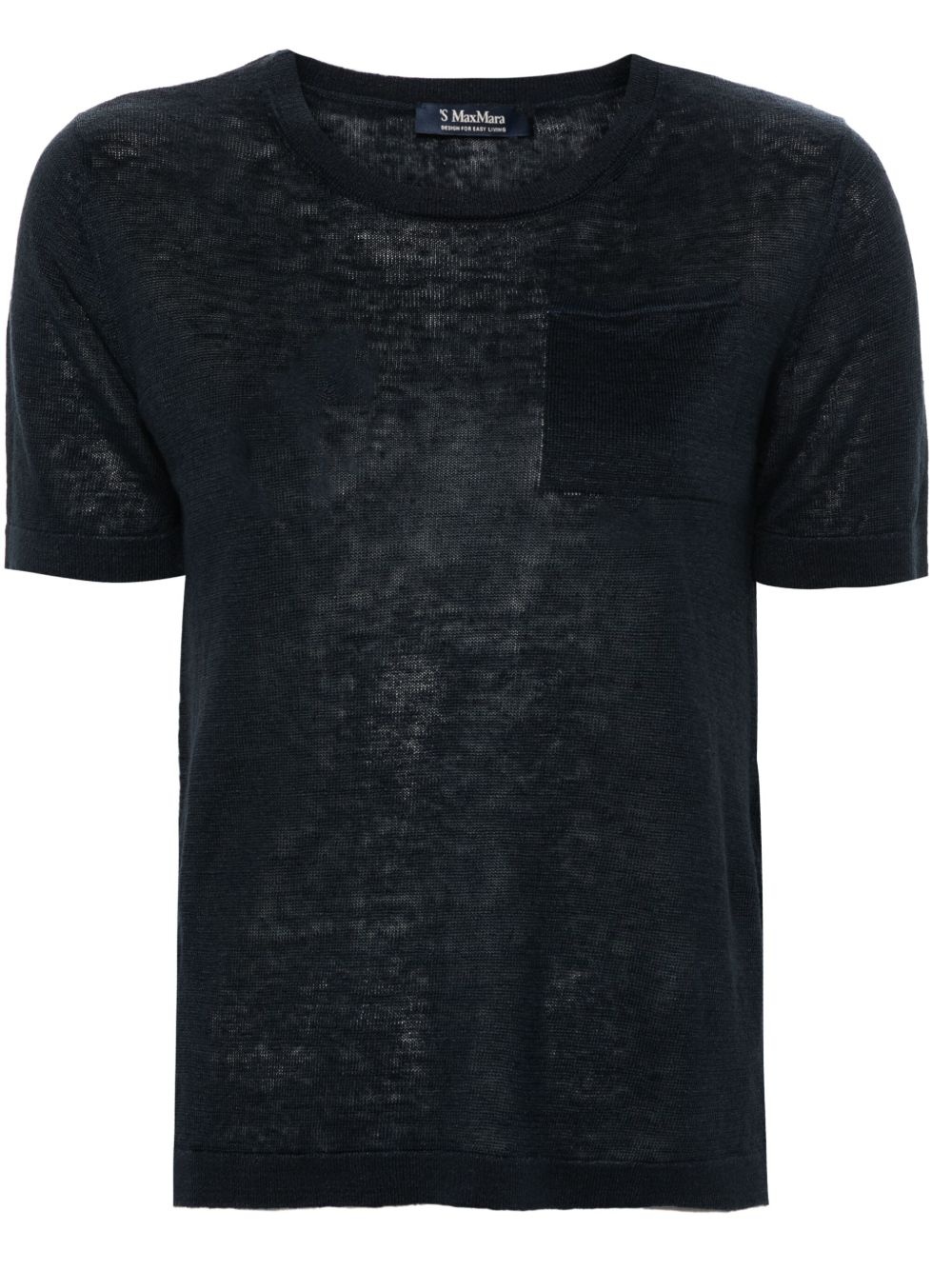 linen knitted top Highlights - Midnight blue - Linen/flax - Knitted construction - Round neck - Short sleeves - Chest patch pocket - Straight hem Made in Italy Composition Linen/Flax 100% SIZE & FIT Model measurements Height 5 ft 9 in(1.75 m) Bust/Chest 34.64 in(88 cm) Hips 36.61 in(93 cm) Waist 26.37 in(67 cm) FittingInformation Designed for a relaxed fit, this piece allows for comfort and movement when worn Made with a midweight knit, this piece offers some stretch This piece fits true to size – take your usual size