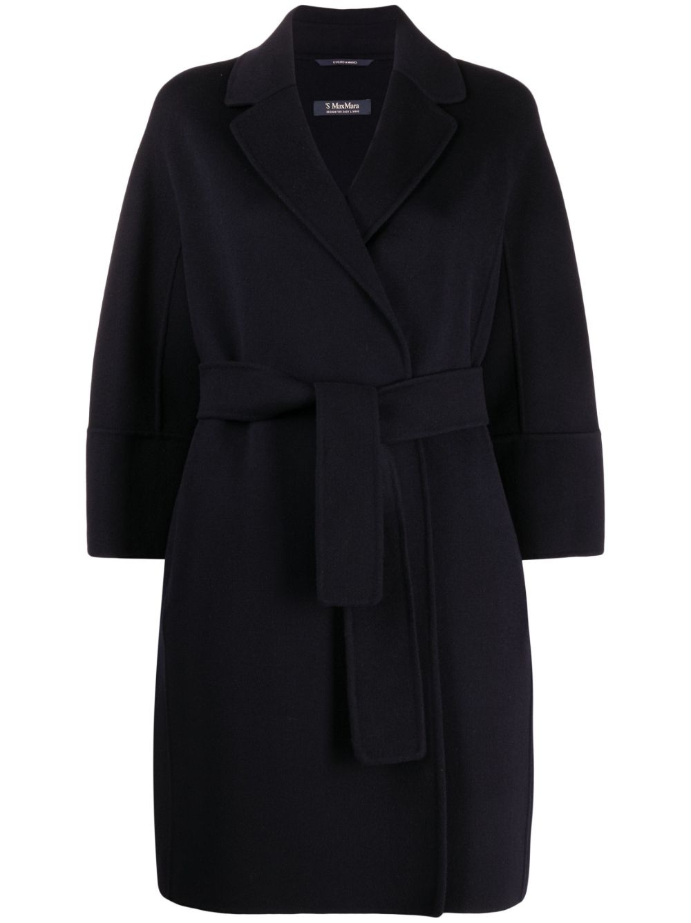 notched-lapels single-breasted coat Constructed from soft virgin wool, this single-breasted coat showcases Max Mara's Italian craftsmanship. In a navy blue hue, this layering piece is punctuated by a practical belted waist. Imported Composition Virgin Wool 100% SIZE & FIT Model measurements Height 5 ft 9 in(1.75 m) Bust/Chest 32.67 in(83 cm) Hips 36.22 in(92 cm) Waist 24.8 in(63 cm) FittingInformation This piece fits true to size. We recommend you get your regular size Cut for a loose fit. Comes with an adjustable belt for a flexible fit at the waist Made with a mid-weight non-stretch fabric Washing instructions Dry Clean Only
