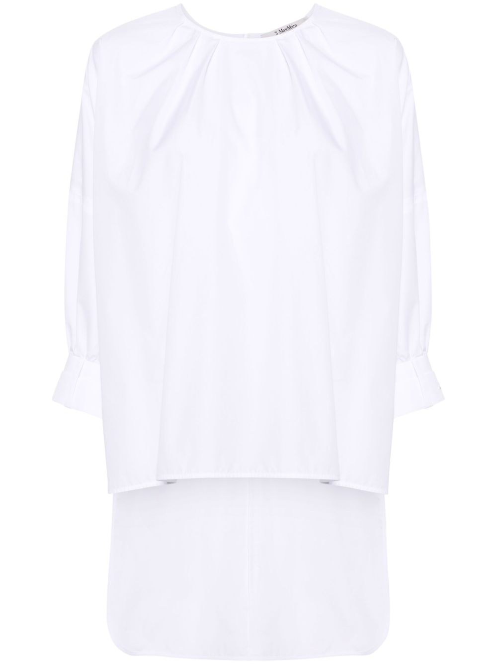 pleated crew-neck blouse Highlights - White - Cotton - Poplin texture - Logo patch at the shoulder - Pleat detailing - Crew neck - Concealed rear zip fastening - Drop shoulder - Long sleeves - Belted cuffs - Side slits - High-low hem - Unlined Imported Composition Cotton 100% SIZE & FIT Model measurements Height 5 ft 10 in(1.78 m) Bust/Chest 31.49 in(80 cm) Hips 35.03 in(89 cm) Waist 23.62 in(60 cm) FittingInformation Designed for an oversized fit, offering additional room throughout Made from a midweight non-stretch fabric This piece fits true to size – take your usual size Washing instructions Machine Wash