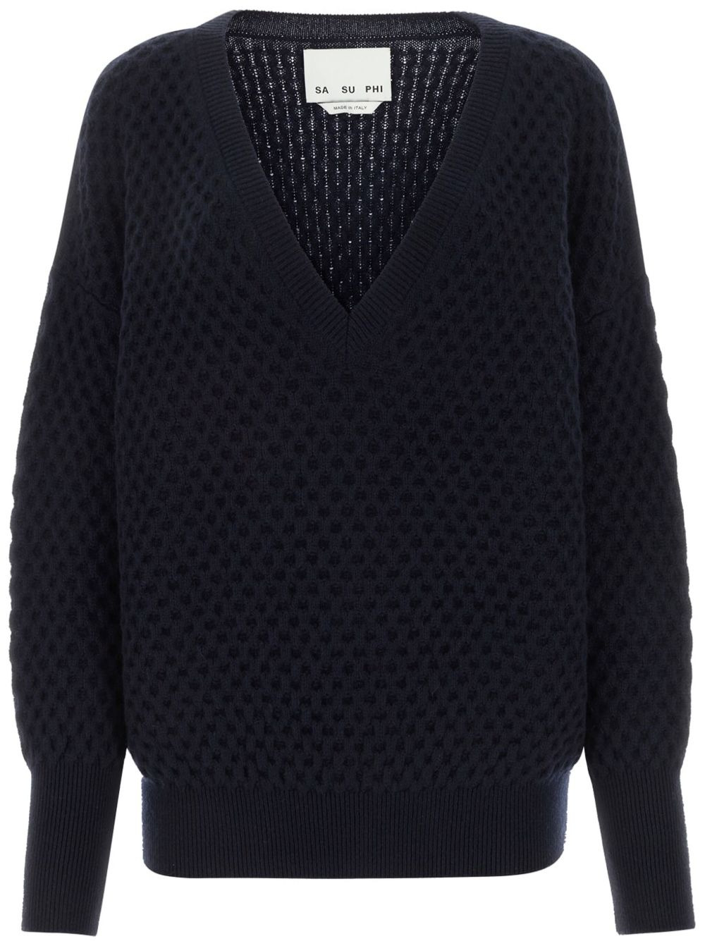 cashmere jumper Highlights - Navy blue - Cashmere - Open knit - V-neck - Long sleeves - Ribbed cuffs and hem - Straight hem Made in Italy Composition Cashmere 100% Washing instructions Read Manufacturer Guidelines