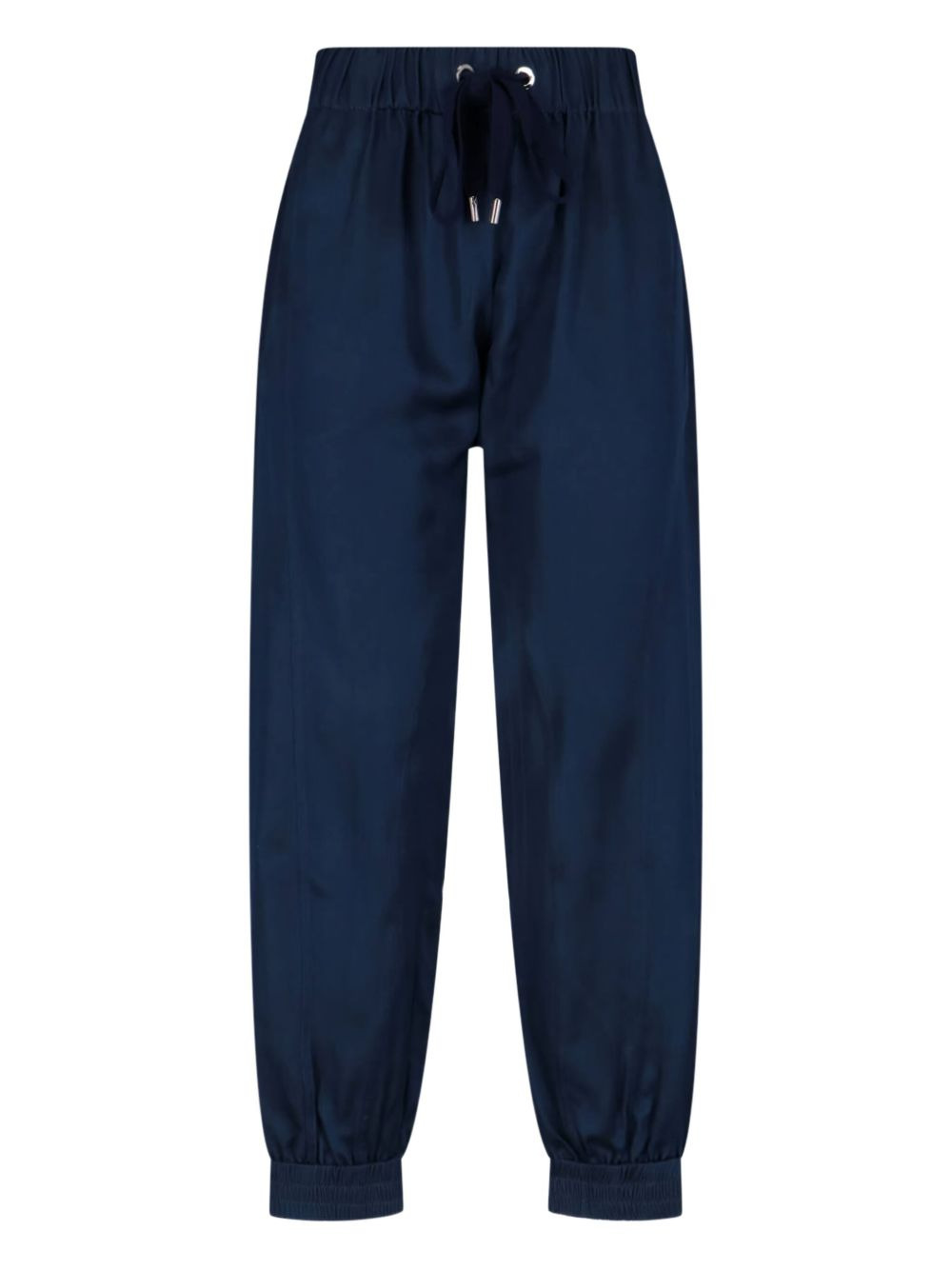 elasticated-cuff trousers Highlights - Navy blue - Elasticated cuffs - Drawstring waistband - Side pockets - Curved yoke detail - Flat front Imported Composition Fabric 100% Washing instructions Read Manufacturer Guidelines