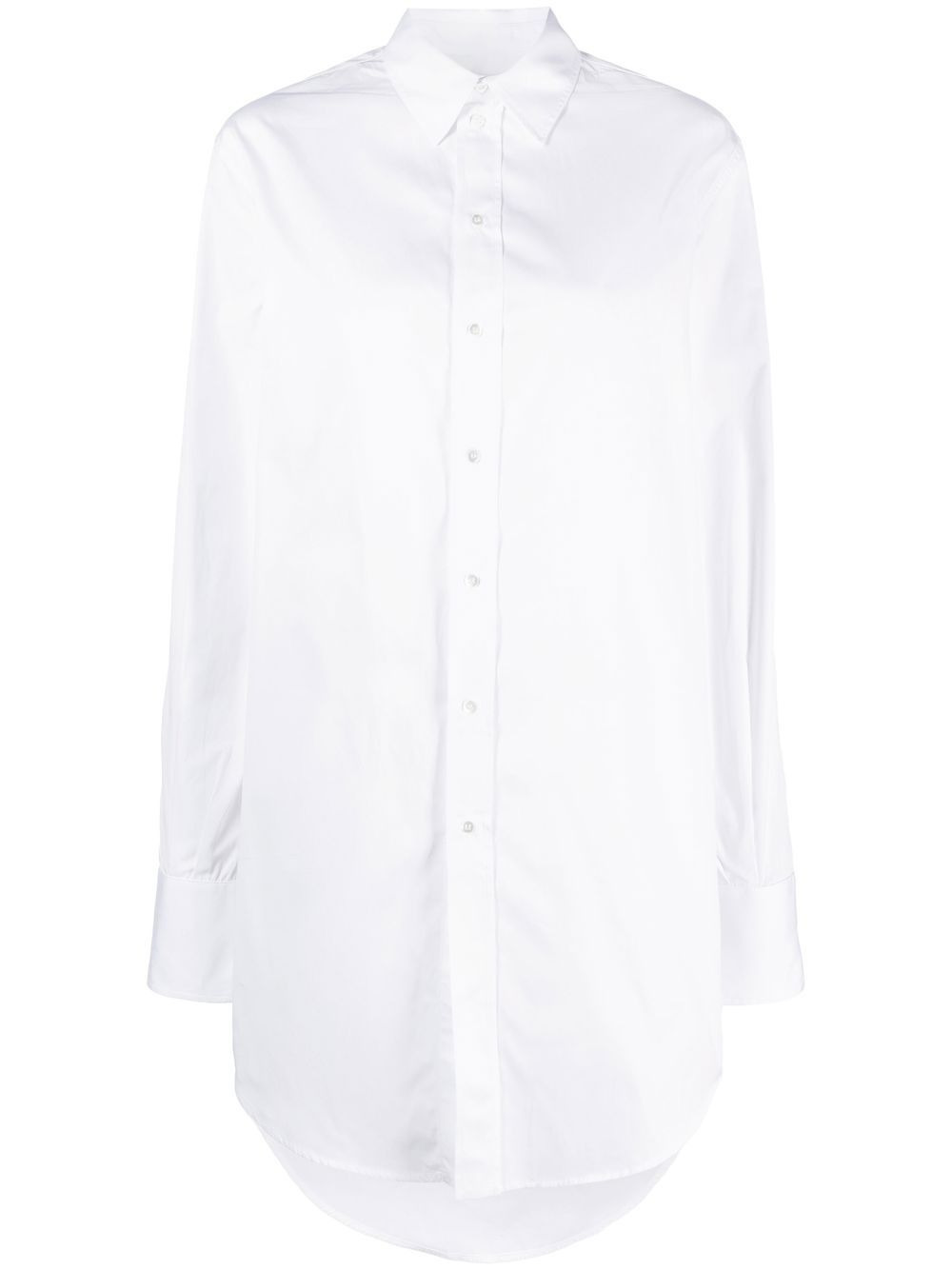 long-length cotton shirt white cotton front button fastening classic collar long sleeves buttoned cuffs curved hem long length Made in Italy Composition Cotton 100% SIZE & FIT Model measurements Height 5 ft 10 in(1.77 m) Bust/Chest 29.92 in(76 cm) Hips 34.25 in(87 cm) Waist 23.62 in(60 cm) FittingInformation This piece fits true to size. We recommend you get your regular size Cut for a loose fit Made with a mid-weight non-stretch fabric Washing instructions Hand Wash