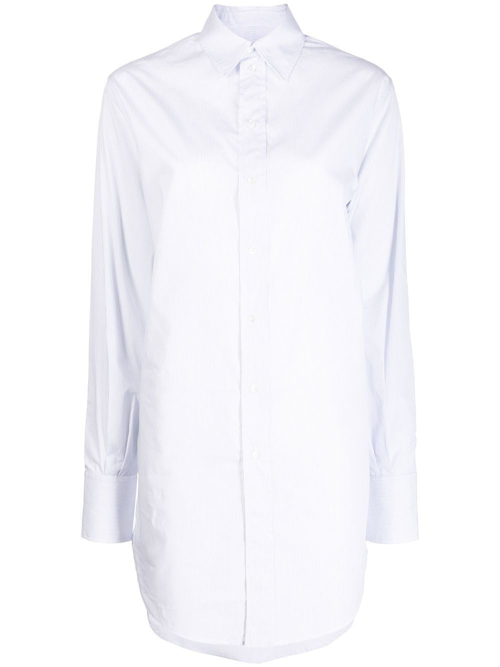 oversized striped shirt dress Highlights - White/blue - Silk - Poplin texture - Pinstripe pattern - Classic collar - Front button fastening - Long sleeves - Buttoned cuffs - Curved hem Made in Italy Composition Silk 100% SIZE & FIT Model measurements Height 5 ft 10 in(1.77 m) Bust/Chest 31.49 in(80 cm) Hips 35.43 in(90 cm) Waist 25.19 in(64 cm) FittingInformation This piece fits true to size. We recommend you get your regular size Cut for a loose fit Made with a mid-weight non-stretch fabric Washing instructions Machine Wash