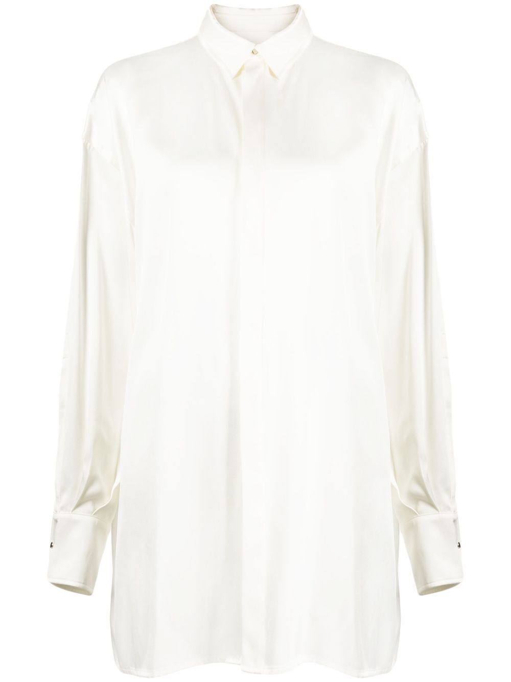 satin long shirt Highlights - Ivory white - Silk blend - Satin finish - Classic collar - Concealed front button fastening - Long puff sleeves - Buttoned cuffs - Extra-long length Made in Italy Composition Body: Silk 57%, Viscose 43% SIZE & FIT Model measurements Height 5 ft 9 in(1.76 m) Bust/Chest 31.1 in(79 cm) Hips 35.03 in(89 cm) Waist 24.4 in(62 cm) Washing instructions Hand Wash