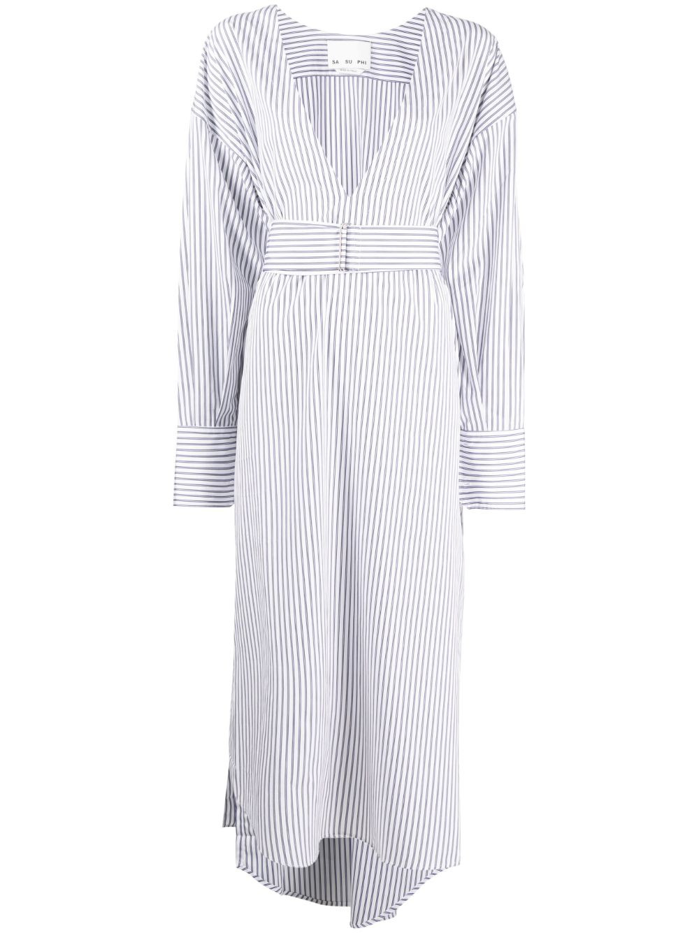 stripe-pattern belted shirt dress Highlights - Navy blue/bone white - Cotton - Vertical stripe pattern - Poplin texture - Plunging v-neck - Belted waist - Extra-long sleeves - Buttoned cuffs - Two thigh-high side slits - Curved hem Made in Italy Composition Body: Cotton 100% SIZE & FIT Model measurements Height 5 ft 9 in(1.76 m) Bust/Chest 31.1 in(79 cm) Hips 35.03 in(89 cm) Waist 24.4 in(62 cm) Washing instructions Dry Clean Only