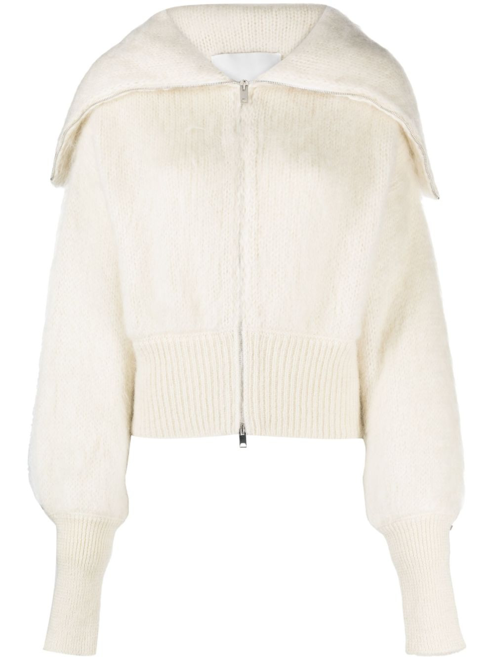 zip-up puff-sleeves cardigan Highlights - Ivory white - Mohair blend - Knitted construction - Wide peak lapels - Front two-way zip fastening - Long puff sleeves - Ribbed cuffs and hem - Straight hem Made in Italy Composition Mohair 67%, Polyamide 28%, Wool 5% SIZE & FIT Model measurements Height 5 ft 9 in(1.76 m) Bust/Chest 31.88 in(81 cm) Hips 35.43 in(90 cm) Waist 24.8 in(63 cm) FittingInformation Designed to be unstructured, offering a loose fit throughout The ribbed hem offers a close, comfortable fit Made with a midweight knit, this piece offers some stretch This piece fits true to size – take your usual size Washing instructions Hand Wash