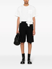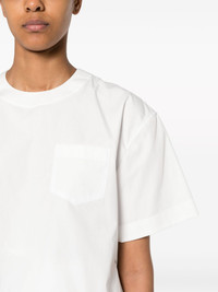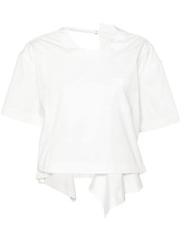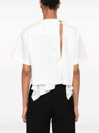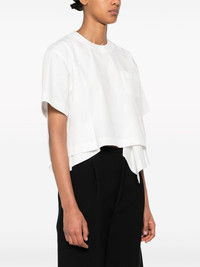 asymmetric poplin T-shirt Japanese brand sacai is known for reinterpreting classic garment construction, as evidenced by this T-shirt. It's cut from white poplin to a cropped length with asymmetric draping to the hemline. Highlights - Off-white - Poplin texture - Round neck - Short sleeves - Chest patch pocket - Keyhole detail to the rear - Rear box-pleat detail - Draped detailing - Short side slits - Internal logo tag - Partial lining - Asymmetric hem - Buckle-strap fastening Imported Composition Polyester 65%, Cotton 35% SIZE & FIT Model measurements Height 5 ft 10 in(1.77 m) Bust/Chest 33.07 in(84 cm) Hips 37 in(94 cm) Waist 24.8 in(63 cm) FittingInformation Designed to be unstructured, offering a loose fit throughout Made from a midweight non-stretch fabric This piece fits true to size – take your usual size Washing instructions Dry Clean Only