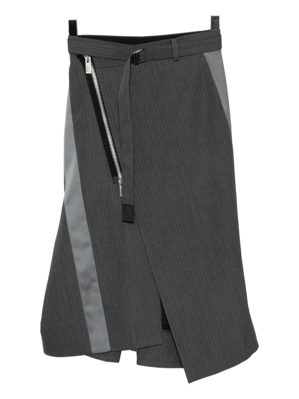 asymmetric skirt Highlights - Smoke grey - Front zip fastening - Front slit - Ruffled detailing Imported Composition Outer: Polyester 55%, Wool 45% Lining: Cupro 100% SIZE & FIT Model measurements Height 5 ft 10 in(1.79 m) Bust/Chest 29.52 in(75 cm) Hips 35.03 in(89 cm) Waist 24.01 in(61 cm) FittingInformation Designed with an asymmetric hem, this skirt is intended to be worn just below the waist The belt offers adjustability for fitted preferences Made from a midweight non-stretch fabric Washing instructions Dry Clean Only