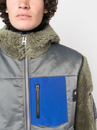 colour-block zip-up hooded jacket Highlights - Slate grey/khaki/cobalt blue - Wool/cotton blend - Faux shearling - Contrast lining - Colour-block panelled design - Rivet detailing - Classic hood - Front two-way zip fastening - Long sleeves - Sleeve zip pocket - Front zip fastening pockets - Two side welt pockets - Ribbed cuffs and hem Imported Composition Lining: Polyester 100% Filling: Polyester 100% Outer: Wool 100%, Cotton 60%, Nylon 40% SIZE & FIT Model measurements Height 6 ft 1 in(1.86 m) Bust/Chest 34.64 in(88 cm) Hips 35.43 in(90 cm) Waist 27.55 in(70 cm) Measurement CHEST 50 in(127 cm) SLEEVE LENGTH 33.85 in(86 cm) Shoulder Width 19.29 in(49 cm) FittingInformation Designed to be unstructured, offering a loose fit throughout The vented hem offers movement at the rear Made from a midweight non-stretch fabric This piece fits true to size – take your usual size Washing instructions Dry Clean Only