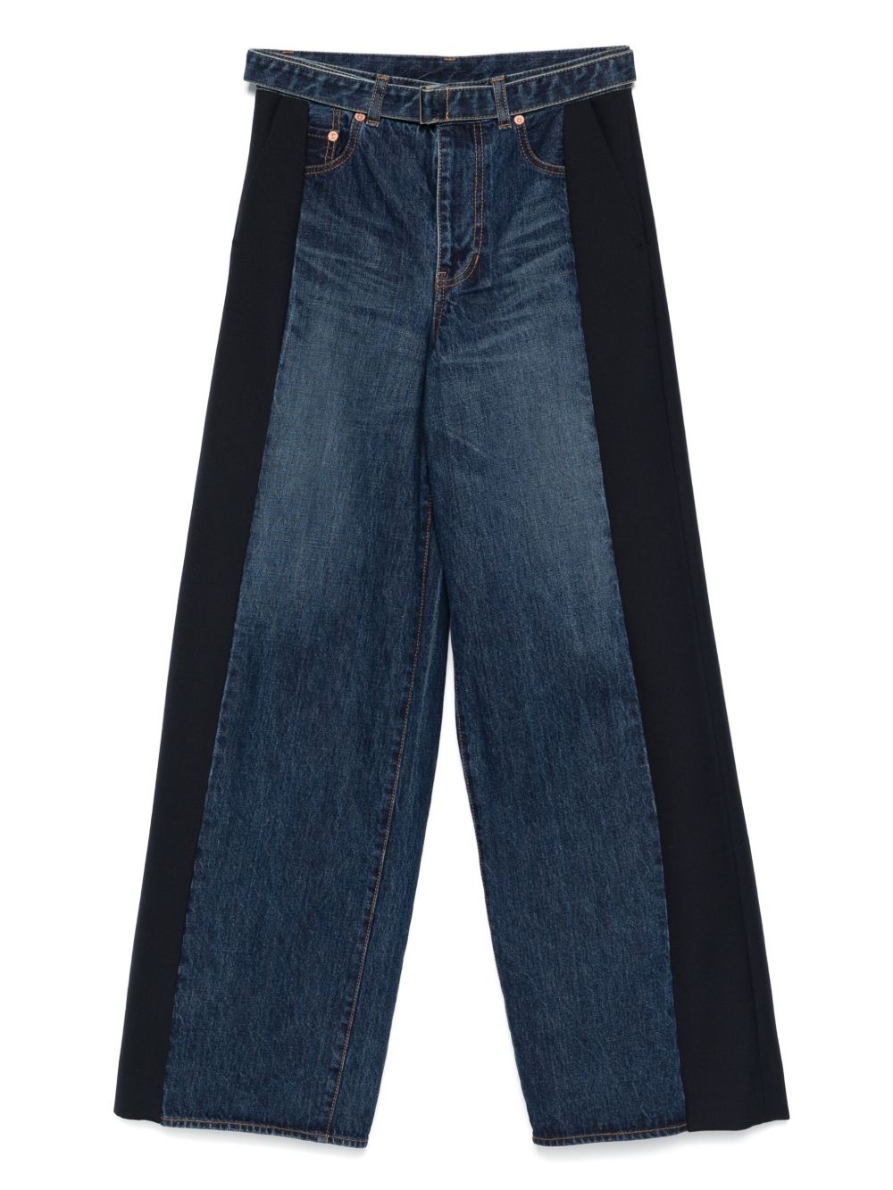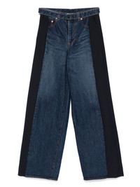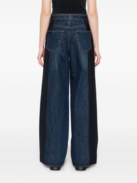 contrast-panel wide-leg jeans Highlights - Indigo blue - Concealed fly and button fastening - Belted waist - Two diagonal pockets to the sides - Two rear patch pockets Imported Composition Outer: Cotton 100%, Polyester 70%, Wool 30% Lining: Polyester 100% SIZE & FIT Model measurements Height 5 ft 9 in(1.75 m) Bust/Chest 31.88 in(81 cm) Hips 34.64 in(88 cm) Waist 24.01 in(61 cm) Measurement FRONT RISE 11.41 in(29 cm) HIPS 36.61 in(93 cm) WAIST 27.55 in(70 cm) FittingInformation Designed with a wide leg cut, these jeans allow for a close fit at the waist and offer a loose and roomy fit over the leg The belt offers adjustability for fitted preferences Sturdy and hard-wearing, this denim piece offers no stretch Washing instructions Dry Clean Only
