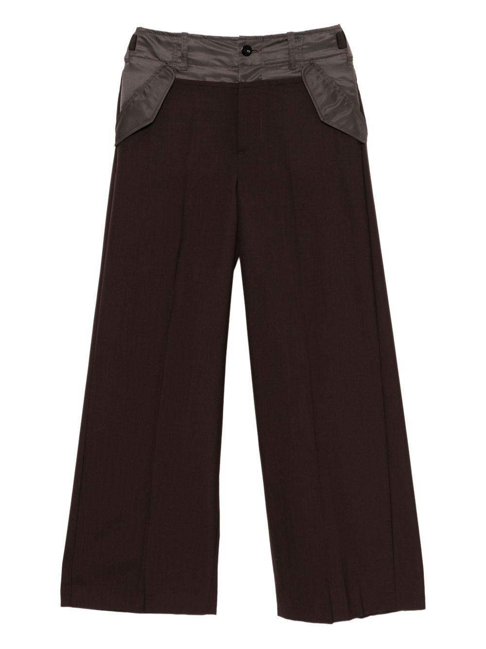 panelled trousers Highlights - Dark brown - Front button and zip fastening - Adjustable side straps - Belt loops Imported Composition Lining: Cupro 100% Outer: Polyester 70%, Wool 30% Polyester 100% SIZE & FIT Model measurements Height 5 ft 10 in(1.78 m) Bust/Chest 31.88 in(81 cm) Hips 37 in(94 cm) Waist 25.19 in(64 cm) FittingInformation Designed with a wide-leg cut, these trousers allow for a close fit at the waist and offer a loose and roomy fit over the leg The adjustable tabs allow for fitted preferences Made from a midweight non-stretch fabric Washing instructions Dry Clean Only
